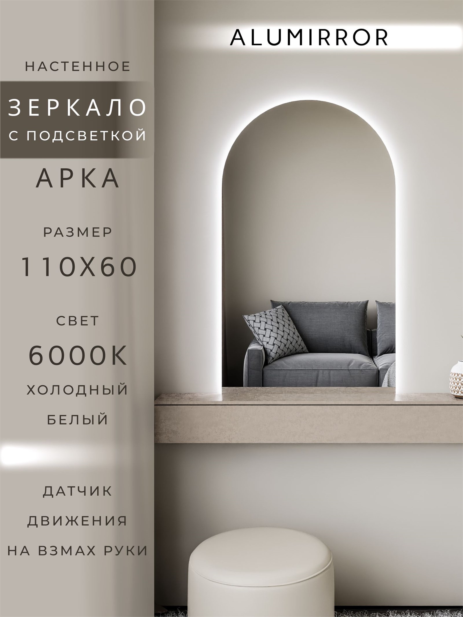 Зеркало настенное 110х60 см. холодный свет 6000К арочное с подсветкой М5 ALUMIRROR