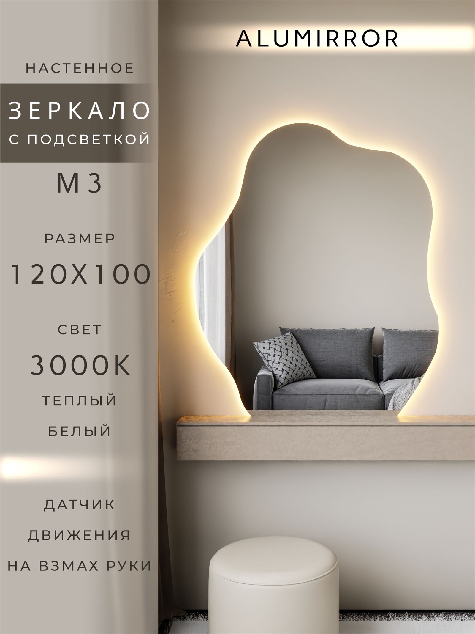 Зеркало настенное 120х100 см. теплый свет 3000К фигурное с подсветкой М3 ALUMIRROR
