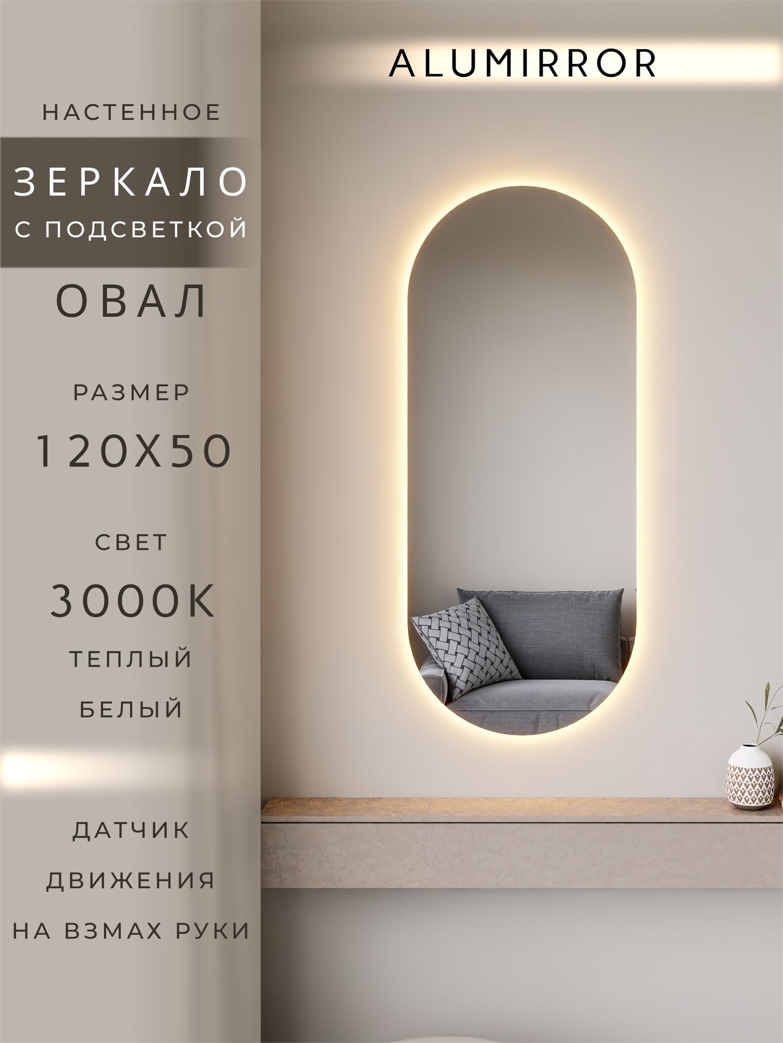 Зеркало настенное 120х50 см. теплый свет 3000К овальное с подсветкой М6 ALUMIRROR