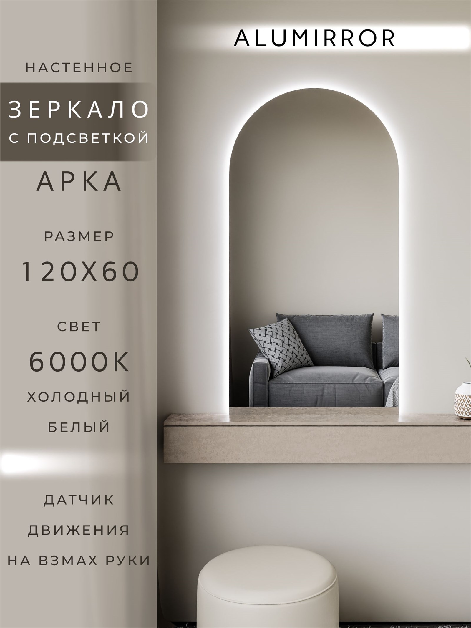 Зеркало настенное 120х60 см. холодный свет 6000К арочное с подсветкой М5 ALUMIRROR