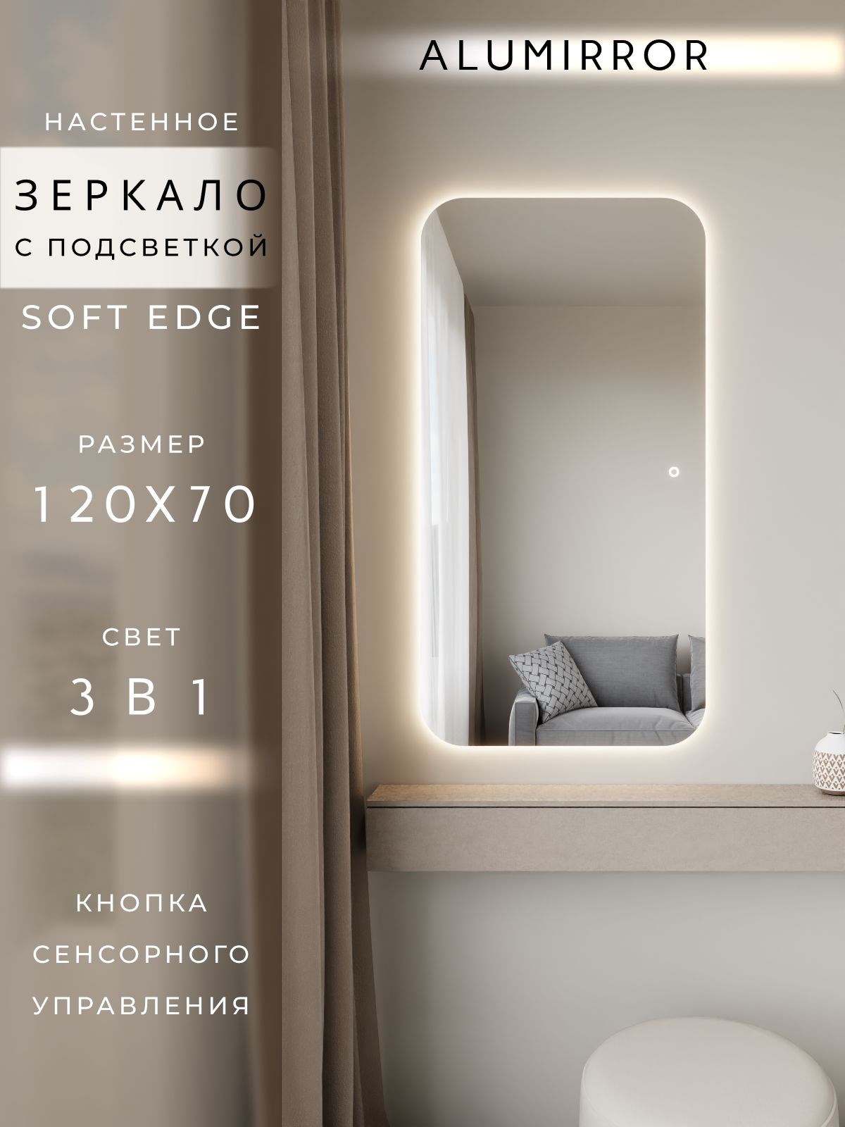 Зеркало настенное 120х70 см. мягкий квадрат ALUMIRROR с подсветкой сенсорное