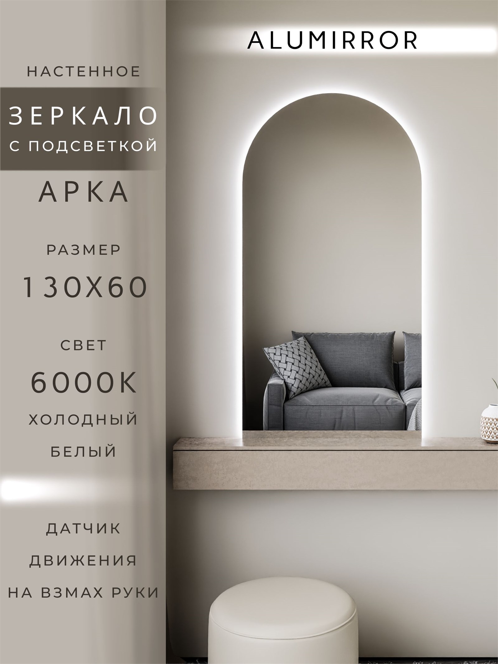 Зеркало настенное 130х60 см. холодный свет 6000К арочное с подсветкой М5 ALUMIRROR