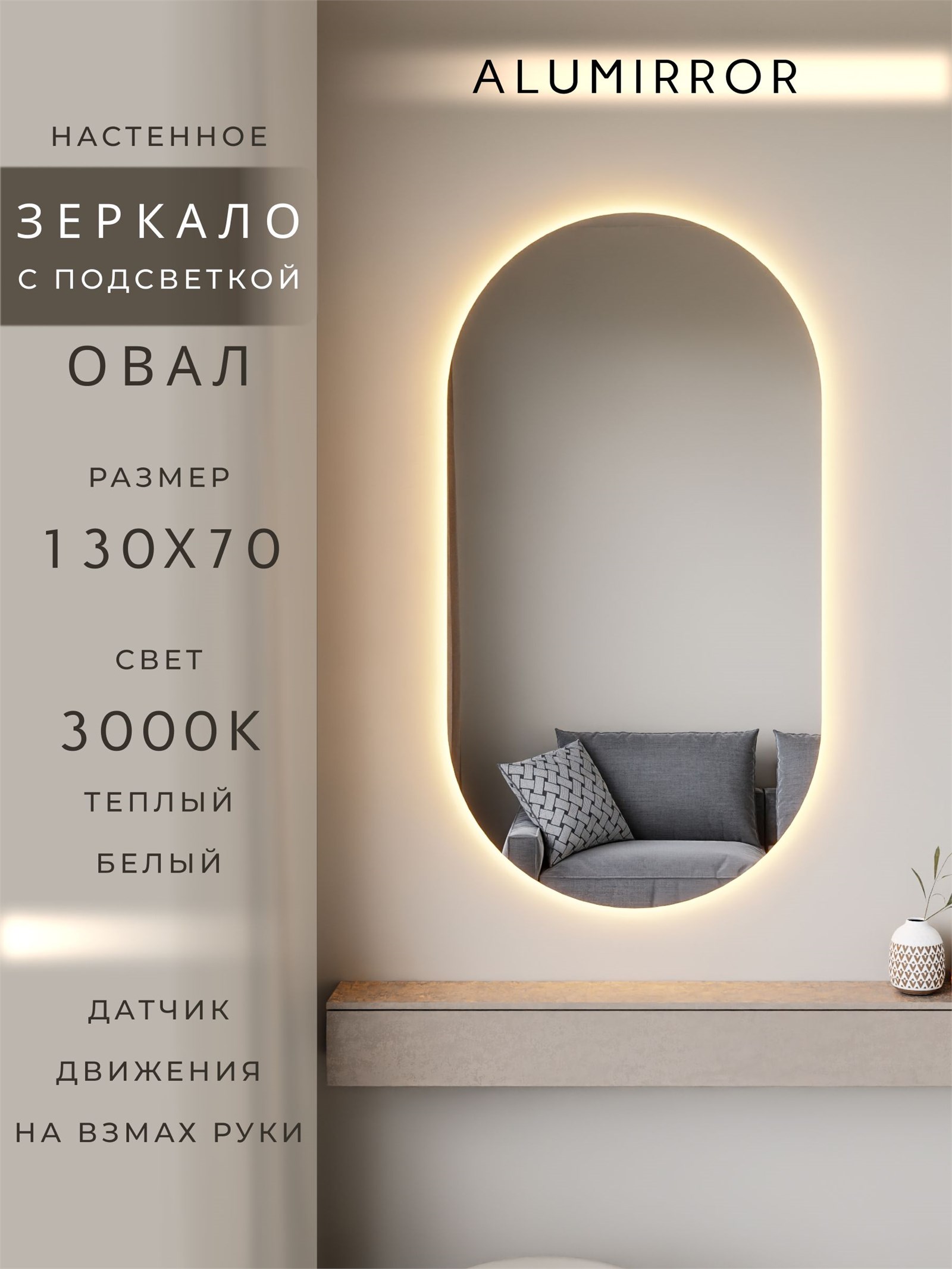 Зеркало настенное 130х70 см. теплый свет 3000К овальное с подсветкой М6 ALUMIRROR