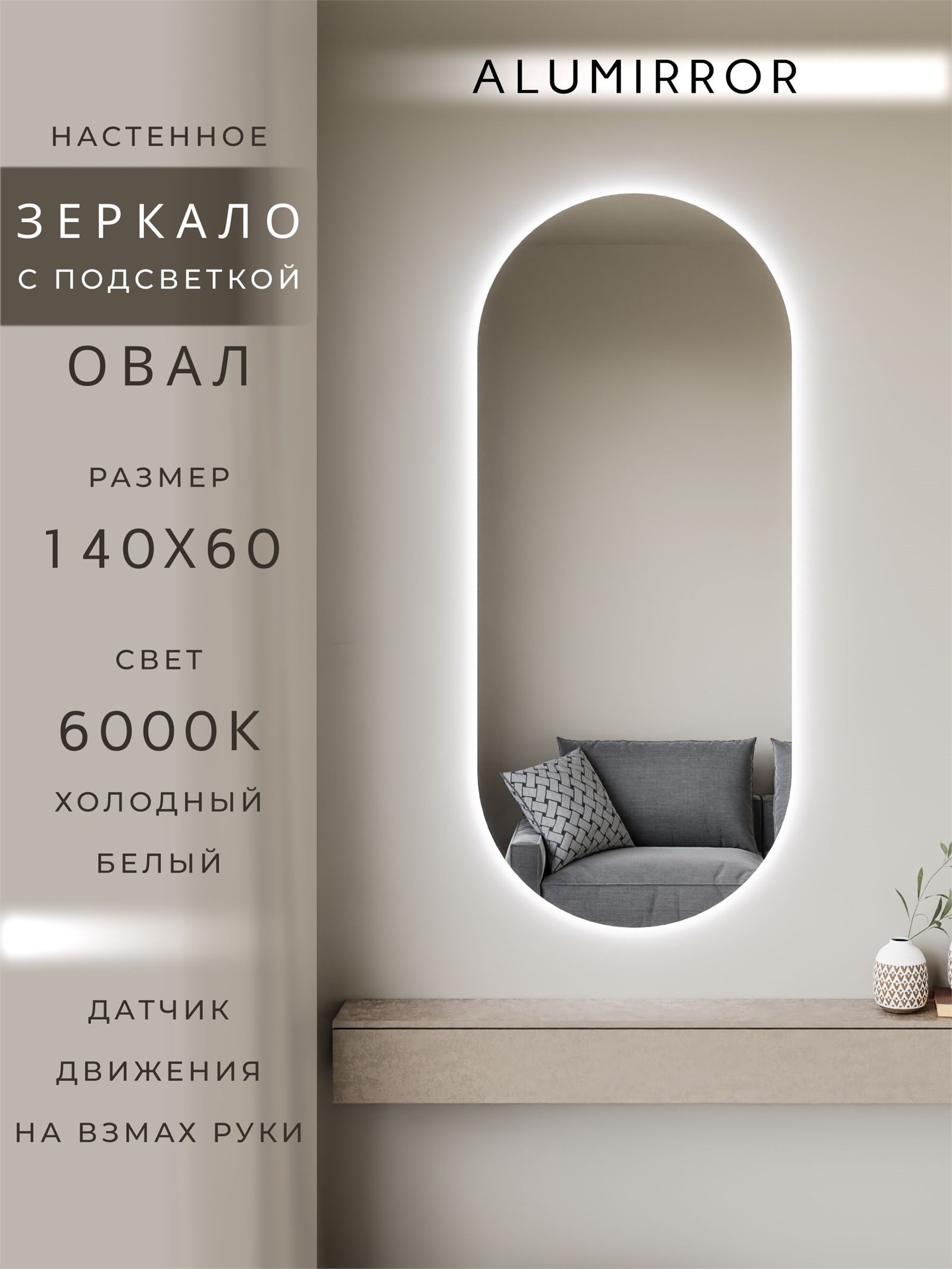 Зеркало настенное 140х60 см. холодный свет 6000К овальное с подсветкой М6 ALUMIRROR