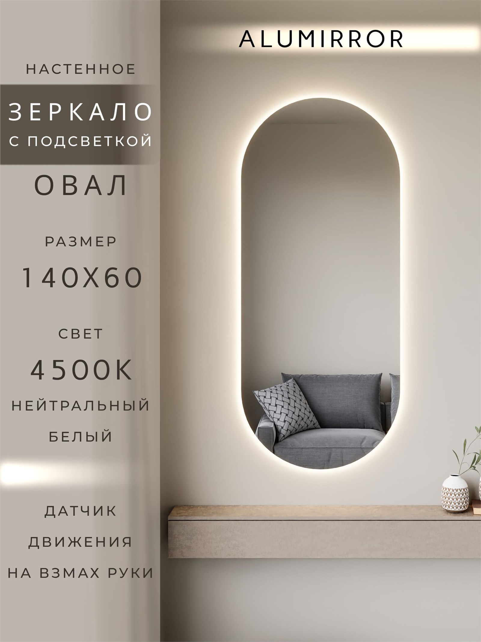 Зеркало настенное 140х60 см. нейтральный свет 4500К овальное с подсветкой М6 ALUMIRROR