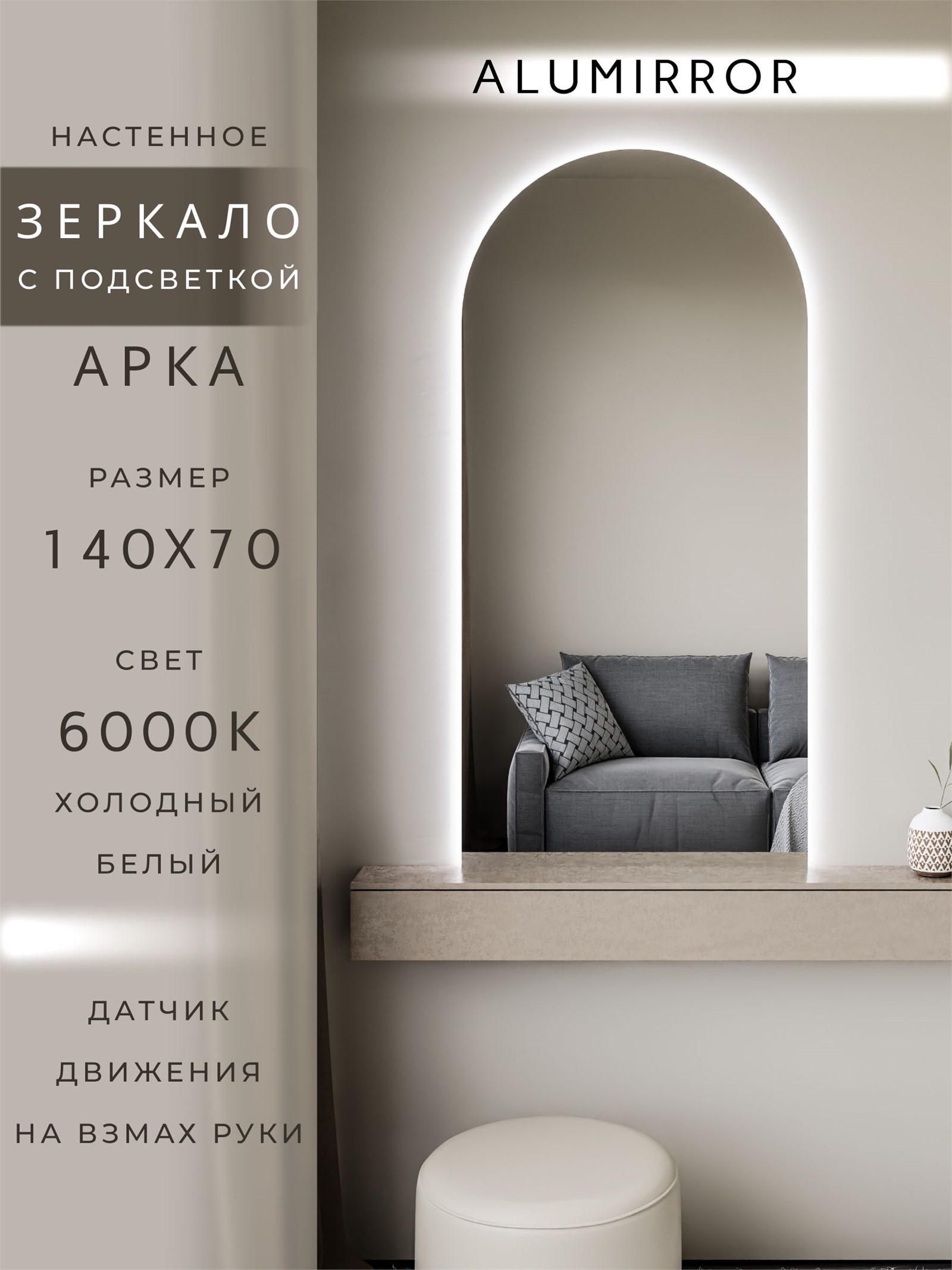 Зеркало настенное 140х70 см. холодный свет 6000К арочное с подсветкой М5 ALUMIRROR