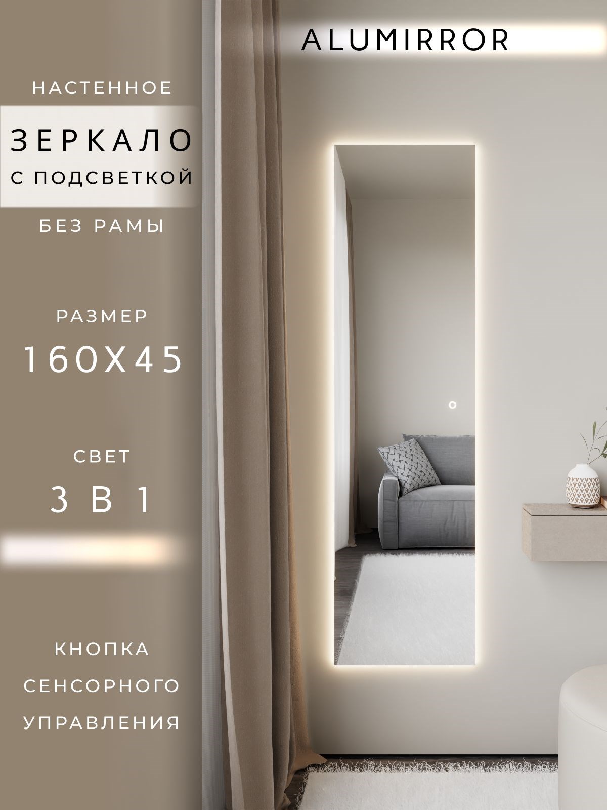 Зеркало настенное 160х45 см с подсветкой сенсорное без рамы интерьерное ALUMIRROR