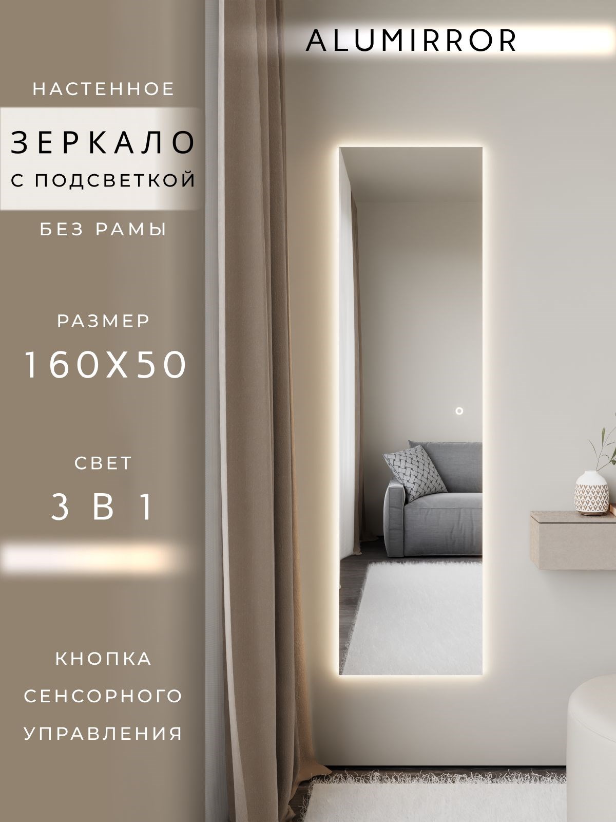 Зеркало настенное с сенсорной подсветкой ALUMIRROR – это идеальный выбор для вашего интерьера. Зеркало отлично подходит для создания стильного и современного образа в любом интерьере.Особенностью данного зеркала является удобная функция подсветки с помощью сенсора. Сенсорный выключатель подсветки позволит вам легко выбрать один из 3-х режимов освещения: (тёплый свет – 3000К, нейтральный свет – 4500К, холодный свет – 6000К), что особенно удобно в зависимости от времени суток и настроения. Используя зеркало с сенсором, вы получите не только функциональный элемент, но и возможность создать для вас уютную атмосферу в помещении. Зеркало данного размера идеально подойдет для размещения в прихожей, в спальне, в ванной комнате или любой другой комнате вашего дома, при этом подготовленные отверстия, с учетом ваших предпочтений позволяют установить зеркало как вертикально, так и горизонтально. Для изготовления зеркала используется зеркальное полотно премиального качества, что позволит наслаждаться четким, красивым и ясным отражением без изъянов и искажений. Кроме того, зеркало обладает повышенной влагостойкостью, устойчиво к коррозии, и с обратной стороны для вашей безопасности защищено противоосколочной пленкой.Зеркало идеально подойдет для макияжа и ежедневного ухода за собой, необходимое освещение поможет вам создать идеальный образ и сделать каждое утро более комфортным. Оно станет незаменимым помощником при подготовке к важным мероприятиям.Не упустите возможность сделать ваше помещение более функциональным и красивым с помощью зеркала с сенсорной подсветкой ALUMIRROR. Создайте уникальную атмосферу и подчеркните свой вкус, выбрав это изысканное изделие.Если остались вопросы по приобретению зеркала, его характеристик или какие либо иные вопросы, которые хотите уточнить – напишите нам в разделе «Написать в магазин», мы обязательно вам ответим.