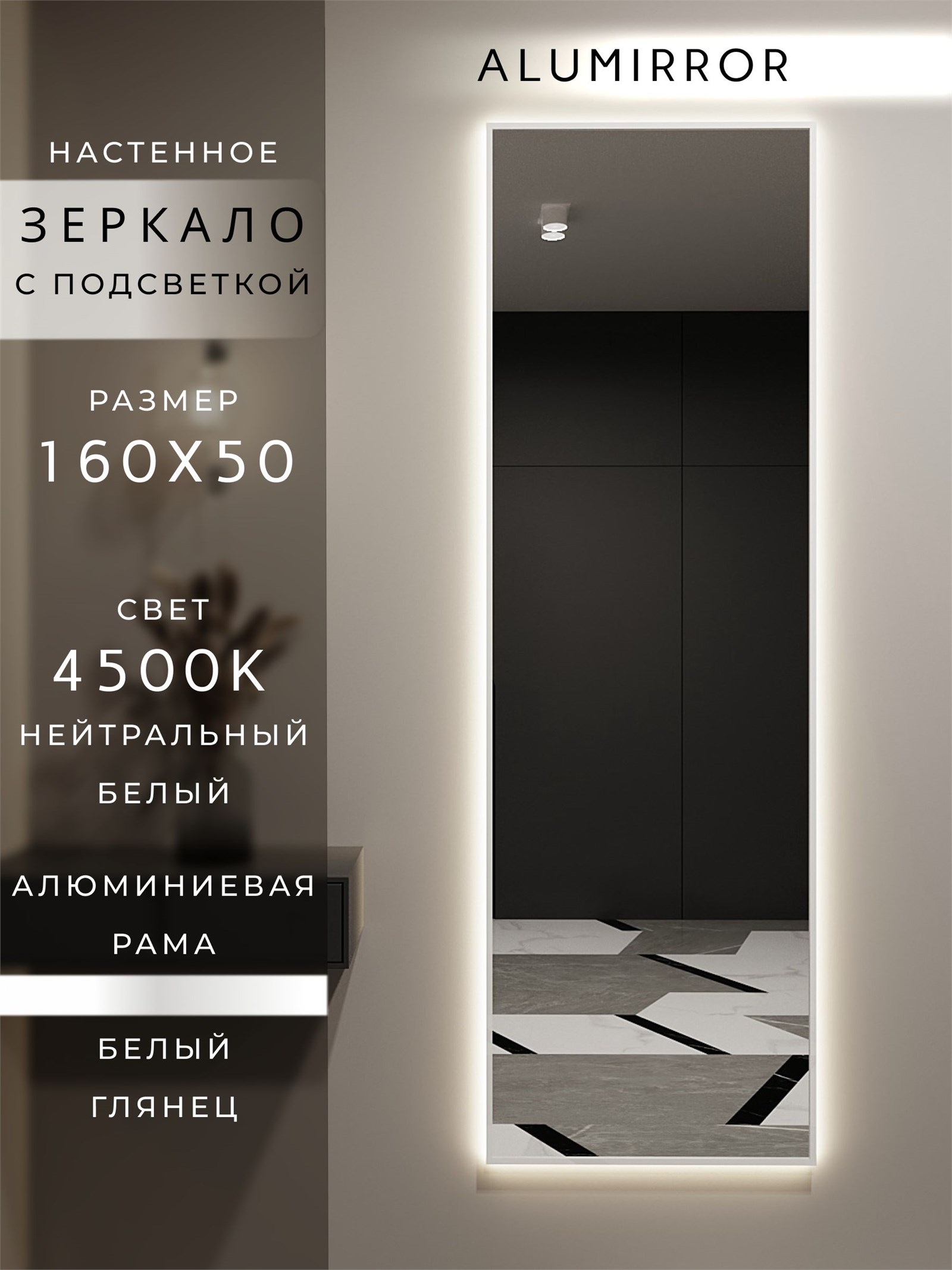 Зеркало настенное 160х50 см с подсветкой. Свет: Нейтральный белый 4500К. В алюминиевой раме интерьерное ALUMIRROR