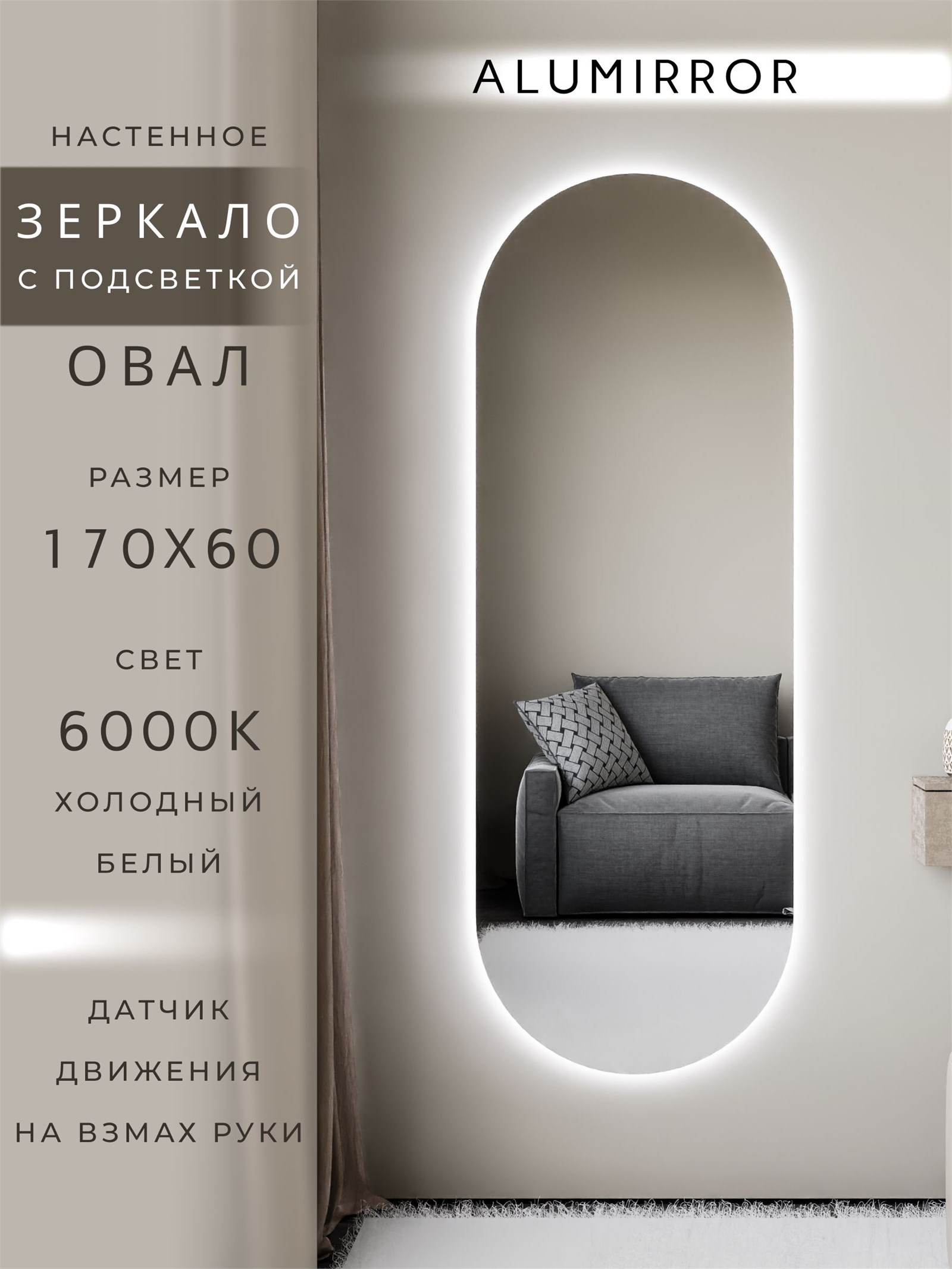 Зеркало настенное 170х60 см. холодный свет 6000К овальное с подсветкой М6 ALUMIRROR