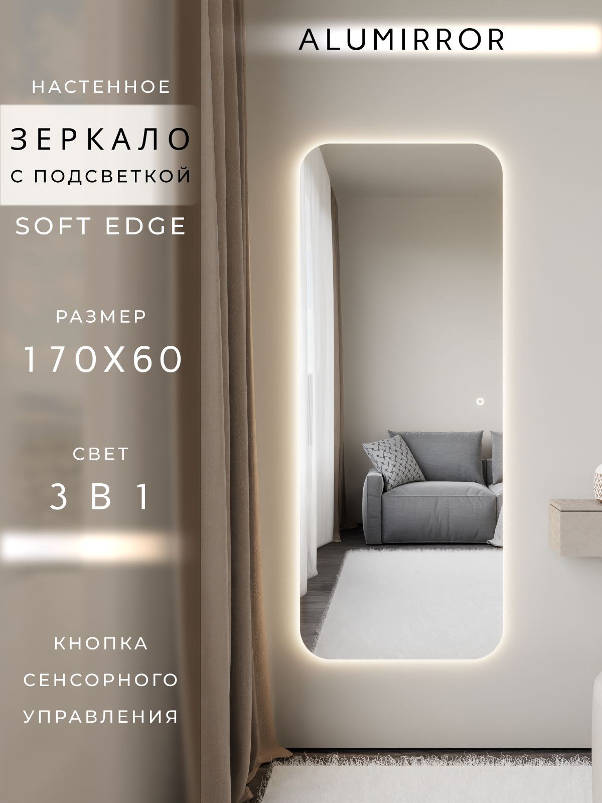 Зеркало настенное 170х60 см. мягкий квадрат ALUMIRROR с подсветкой сенсорное