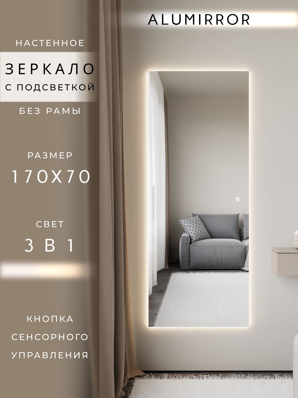 Зеркало настенное 170х70 см с подсветкой сенсорное без рамы интерьерное ALUMIRROR