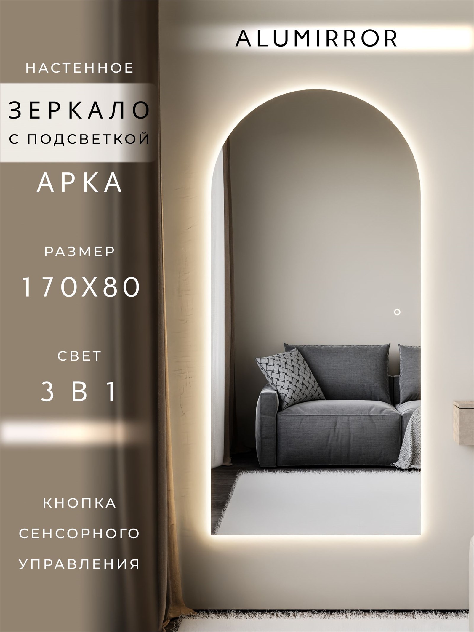 Зеркало настенное 170х80 см. сенсорное арочное с подсветкой М5 ALUMIRROR