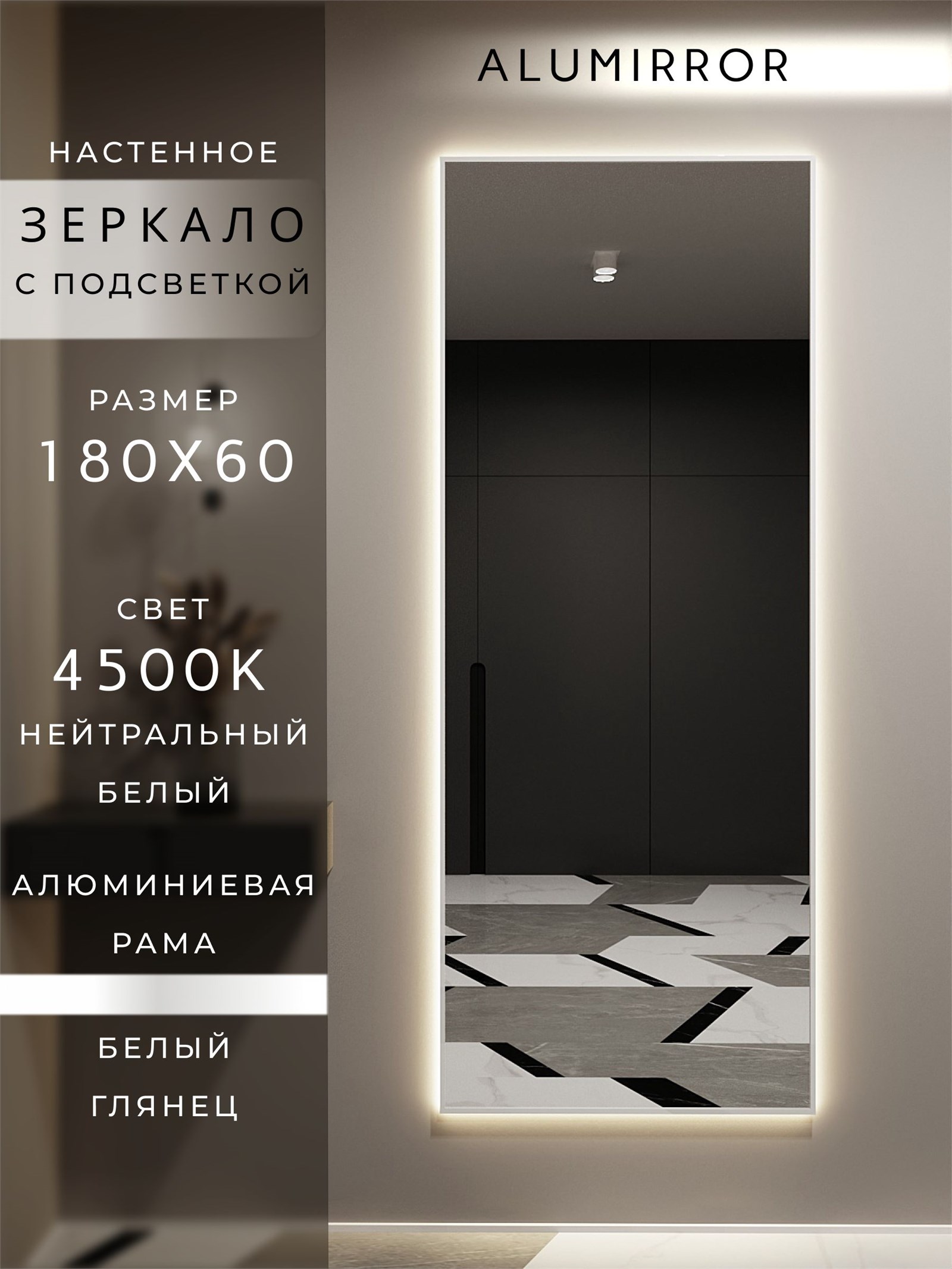 Зеркало настенное 180х60 см с подсветкой. Свет: Нейтральный белый 4500К. В алюминиевой раме интерьерное ALUMIRROR