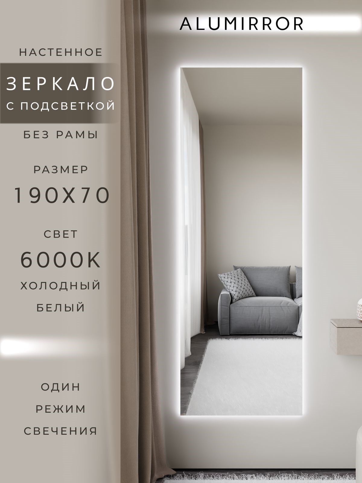 Зеркало настенное 190х70 см с подсветкой. Свет: Холодный белый 6000К. Без рамы интерьерное ALUMIRROR