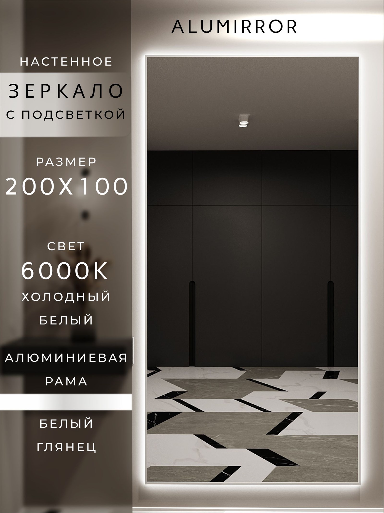 Зеркало настенное 200х100 см с подсветкой. Свет: Холодный белый 6000К. В алюминиевой раме интерьерное ALUMIRROR