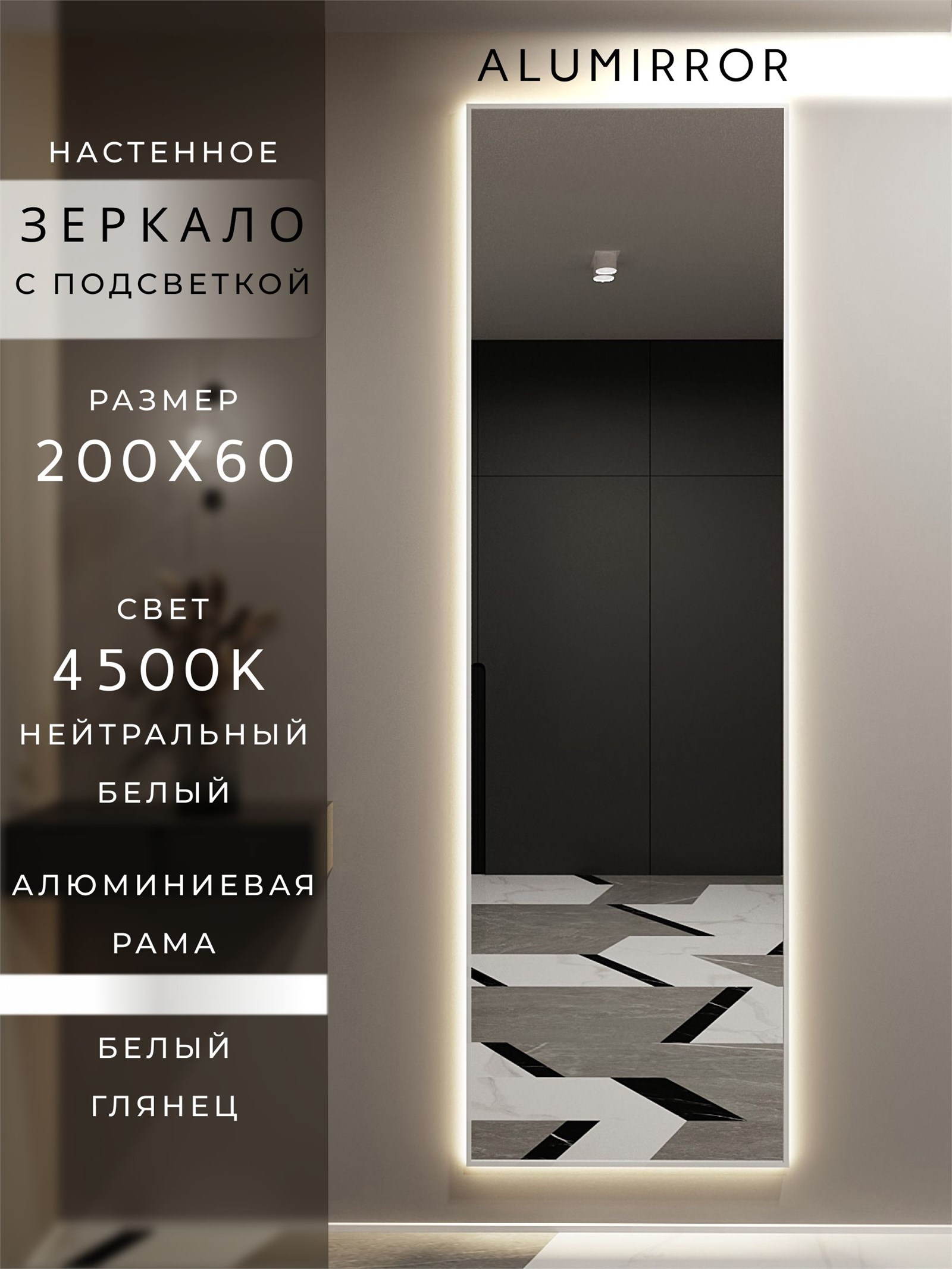 Зеркало настенное 200х60 см с подсветкой. Свет: Нейтральный белый 4500К. В алюминиевой раме интерьерное ALUMIRROR
