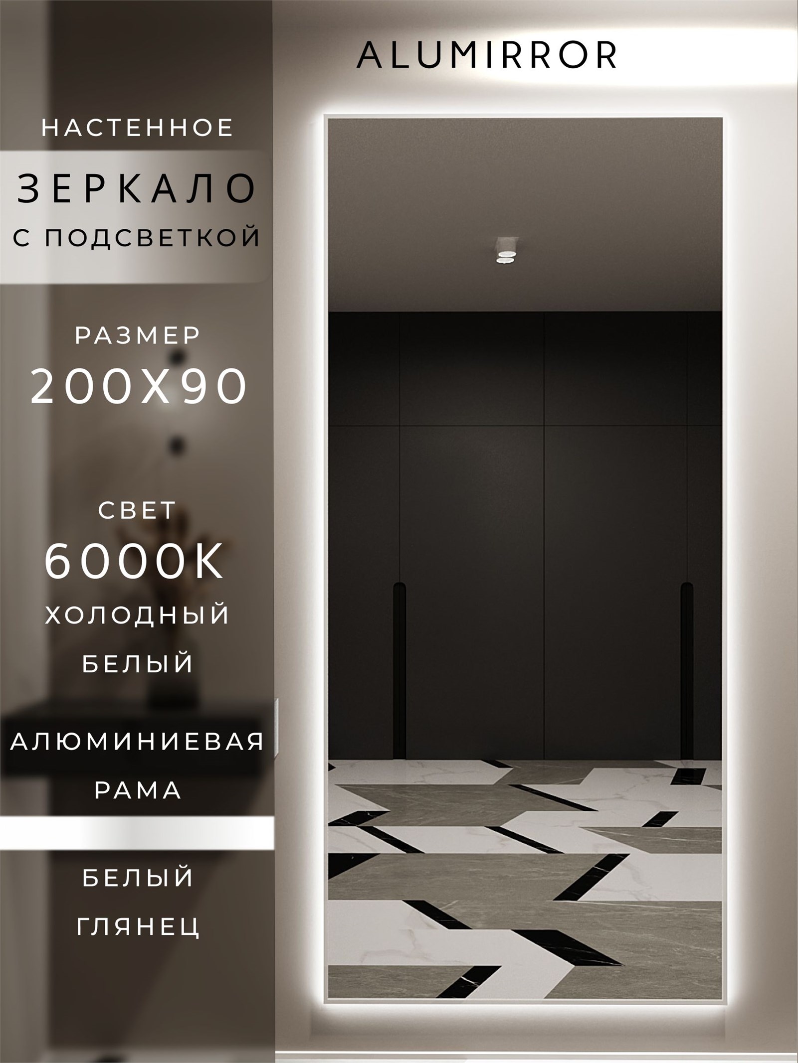 Зеркало настенное 200х90 см с подсветкой. Свет: Холодный белый 6000К. В алюминиевой раме интерьерное ALUMIRROR