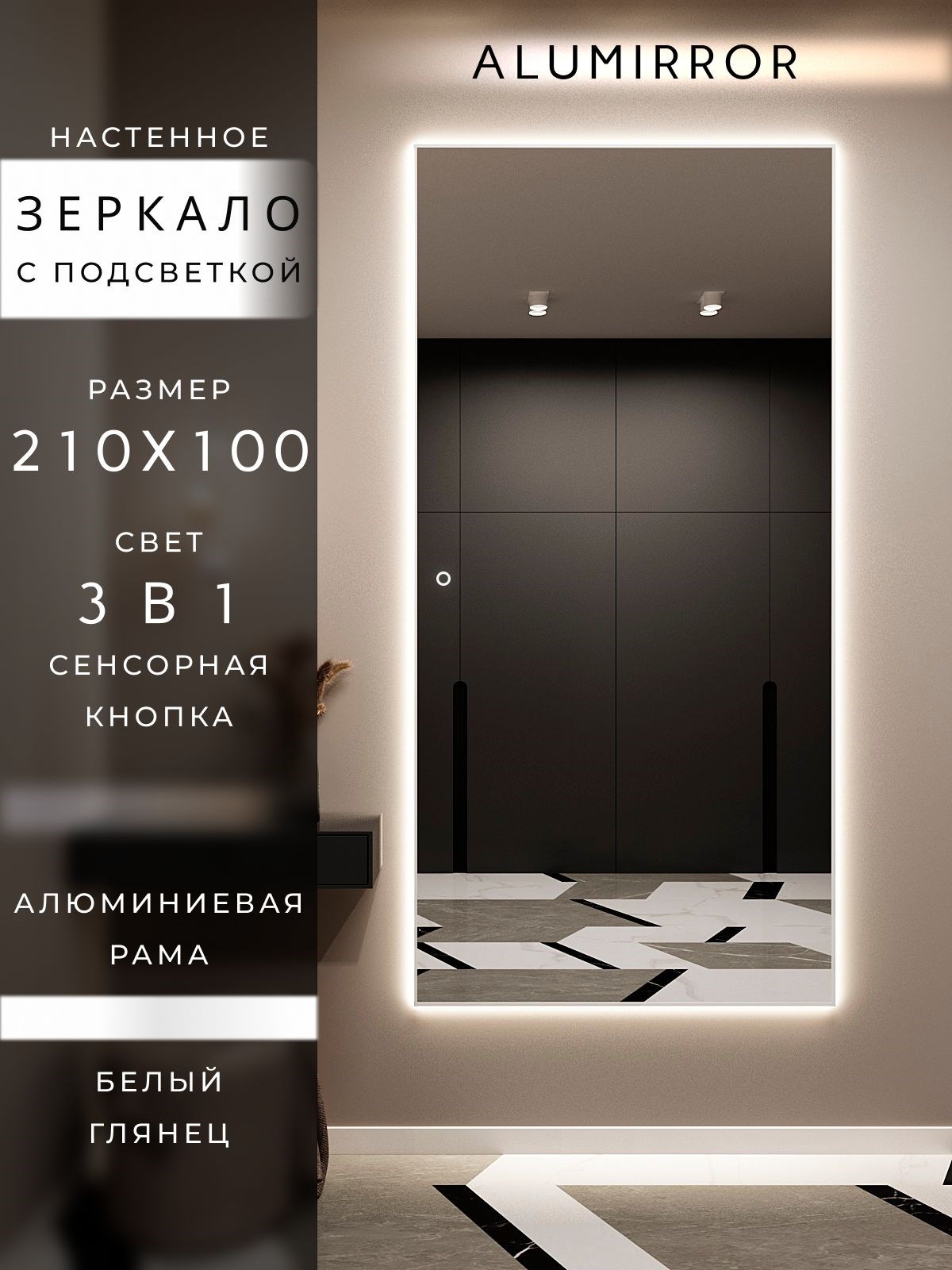 Зеркало настенное с сенсорной подсветкой ALUMIRROR – это идеальный выбор для вашего интерьера. Зеркало отлично подходит для создания стильного и современного образа в любом интерьере.Особенностью данного зеркала является удобная функция подсветки с помощью сенсора. Сенсорный выключатель подсветки позволит вам легко выбрать один из 3-х режимов освещения: (тёплый свет – 3000К, нейтральный свет – 4500К, холодный свет – 6000К), что особенно удобно в зависимости от времени суток и настроения. Используя зеркало с сенсором, вы получите не только функциональный элемент, но и возможность создать для вас уютную атмосферу в помещении. Зеркало данного размера идеально подойдет для размещения в прихожей, в спальне, в ванной комнате или любой другой комнате вашего дома, при этом подготовленные отверстия, с учетом ваших предпочтений позволяют установить зеркало как вертикально, так и горизонтально. Благодаря элегантной алюминиевой раме, изготовленной из высококачественного анодированного профиля российского производства, зеркало станет стильным акцентом в вашем интерьере. Алюминиевая рама подчеркнет элегантность вашего интерьера, и добавит в него изысканность. Для изготовления зеркала используется зеркальное полотно премиального качества, что позволит наслаждаться четким, красивым и ясным отражением без изъянов и искажений. Кроме того, зеркало обладает повышенной влагостойкостью, устойчиво к коррозии, и с обратной стороны для вашей безопасности защищено противоосколочной пленкой.Зеркало идеально подойдет для макияжа и ежедневного ухода за собой, необходимое освещение поможет вам создать идеальный образ и сделать каждое утро более комфортным. Оно станет незаменимым помощником при подготовке к важным мероприятиям.Не упустите возможность сделать ваше помещение более функциональным и красивым с помощью зеркала с сенсорной подсветкой ALUMIRROR. Создайте уникальную атмосферу и подчеркните свой вкус, выбрав это изысканное изделие.Если остались вопросы по приобретению зеркала, его характеристик или какие либо иные вопросы, которые хотите уточнить – напишите нам в разделе «Написать в магазин», мы обязательно вам ответим.