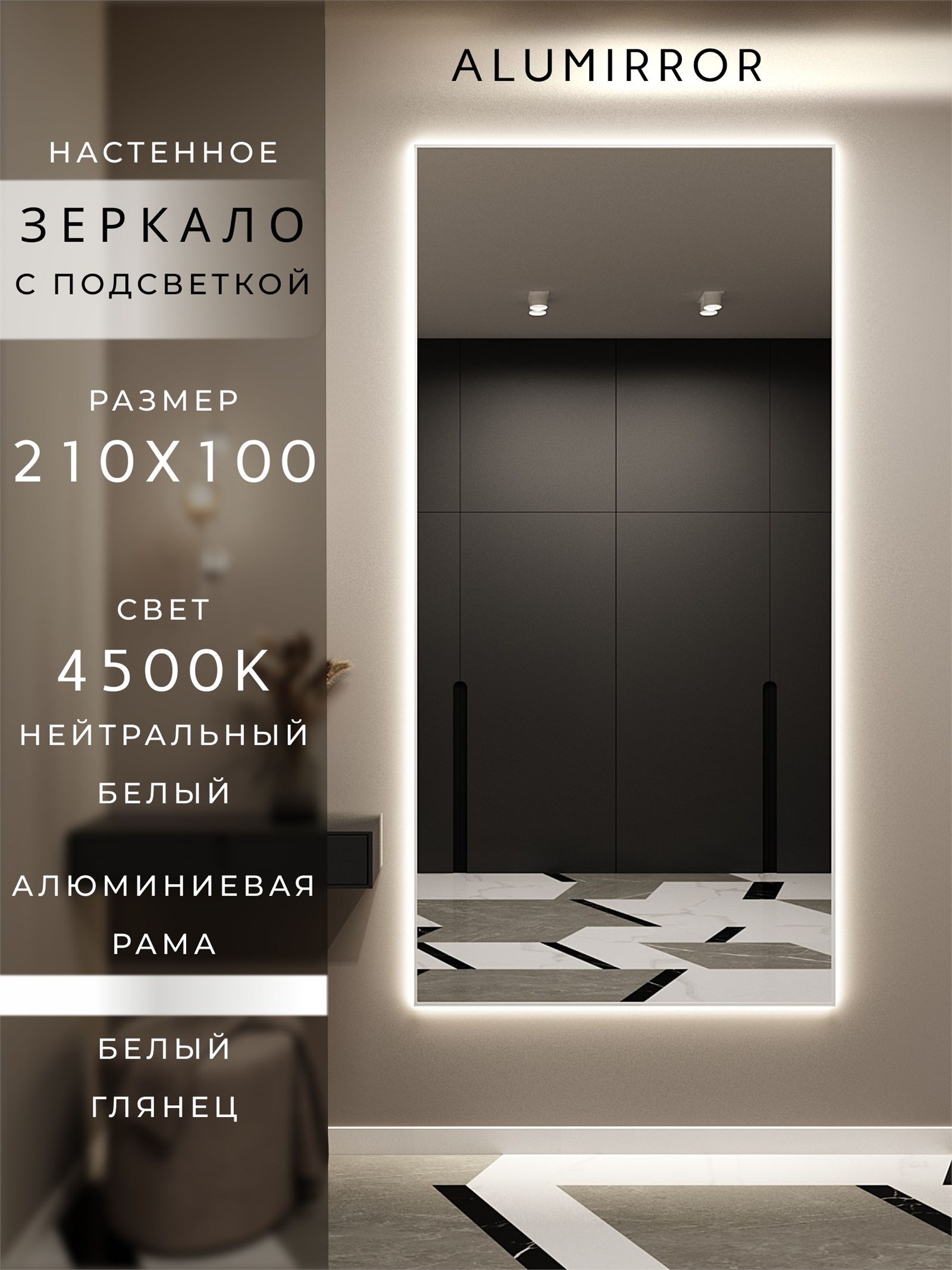 Зеркало настенное 210х100 см с подсветкой. Свет: Нейтральный белый 4500К. В алюминиевой раме интерьерное ALUMIRROR