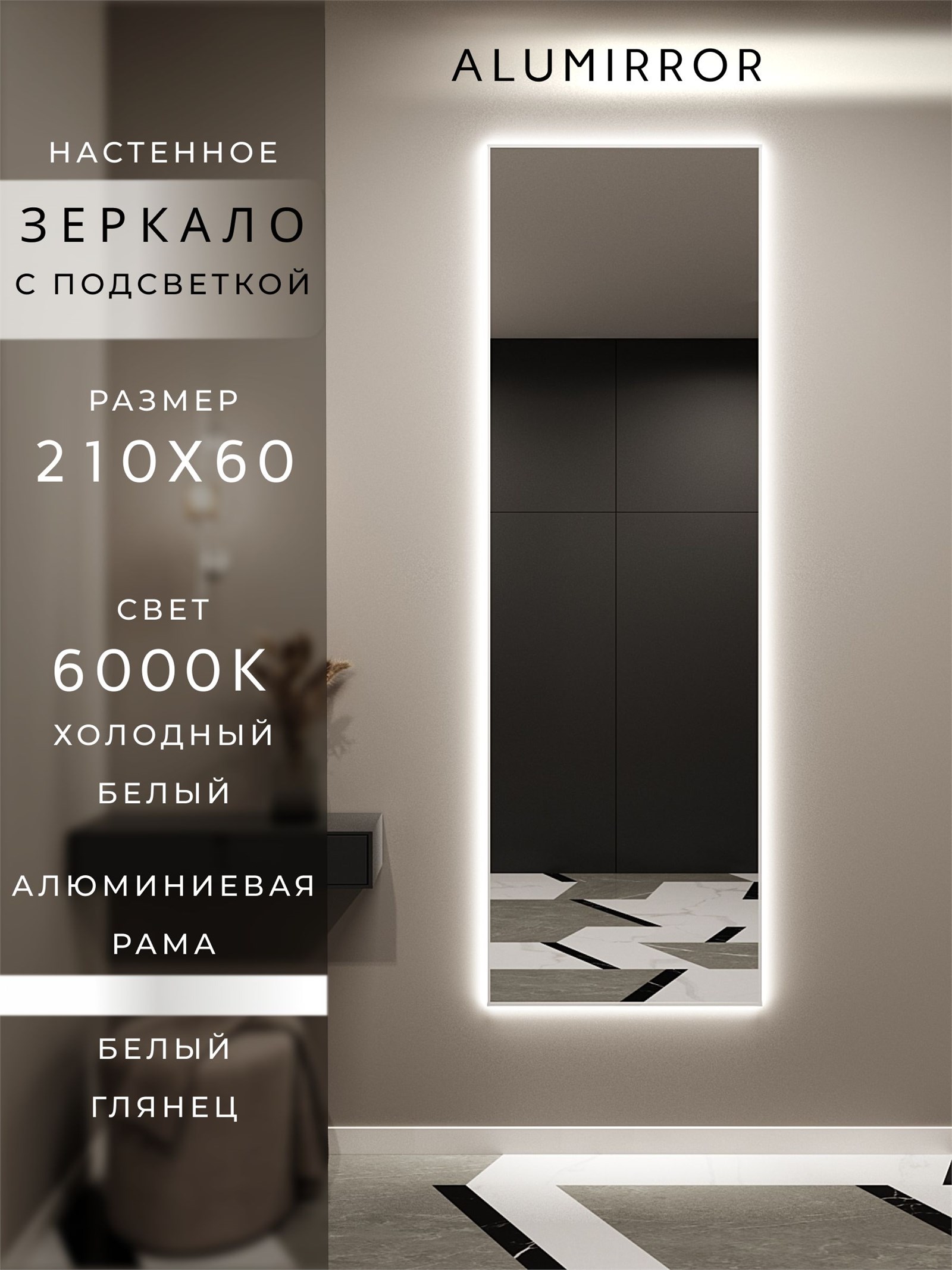 Зеркало настенное 210х60 см с подсветкой. Свет: Холодный белый 6000К. В алюминиевой раме интерьерное ALUMIRROR