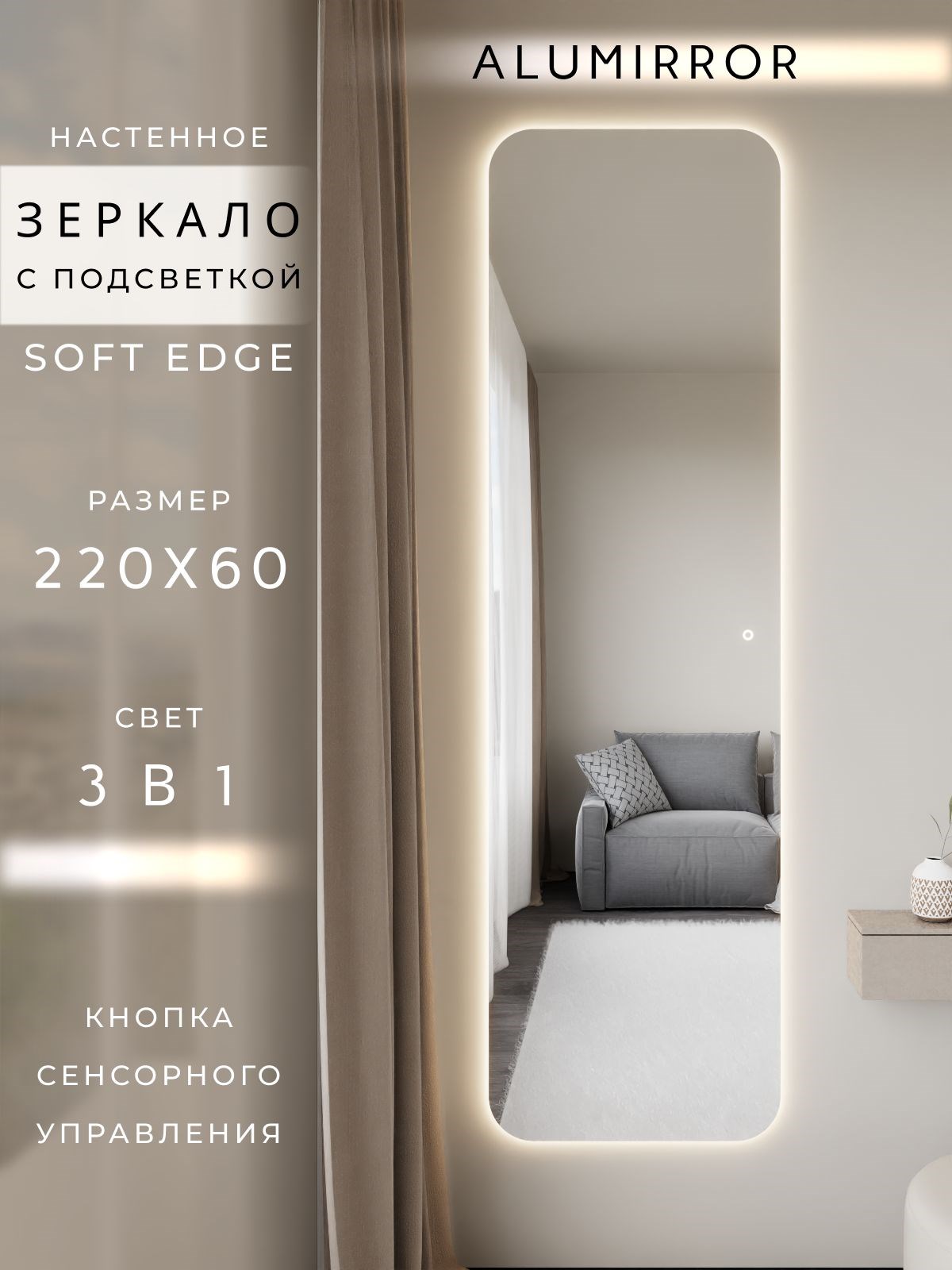Зеркало настенное 220х60 см. мягкий квадрат ALUMIRROR с подсветкой сенсорное