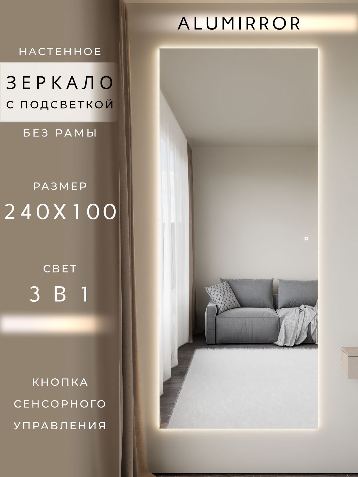 Зеркало настенное с сенсорной подсветкой ALUMIRROR – это идеальный выбор для вашего интерьера. Зеркало отлично подходит для создания стильного и современного образа в любом интерьере.Особенностью данного зеркала является удобная функция подсветки с помощью сенсора. Сенсорный выключатель подсветки позволит вам легко выбрать один из 3-х режимов освещения: (тёплый свет – 3000К, нейтральный свет – 4500К, холодный свет – 6000К), что особенно удобно в зависимости от времени суток и настроения. Используя зеркало с сенсором, вы получите не только функциональный элемент, но и возможность создать для вас уютную атмосферу в помещении. Зеркало данного размера идеально подойдет для размещения в прихожей, в спальне, в ванной комнате или любой другой комнате вашего дома, при этом подготовленные отверстия, с учетом ваших предпочтений позволяют установить зеркало как вертикально, так и горизонтально. Для изготовления зеркала используется зеркальное полотно премиального качества, что позволит наслаждаться четким, красивым и ясным отражением без изъянов и искажений. Кроме того, зеркало обладает повышенной влагостойкостью, устойчиво к коррозии, и с обратной стороны для вашей безопасности защищено противоосколочной пленкой.Зеркало идеально подойдет для макияжа и ежедневного ухода за собой, необходимое освещение поможет вам создать идеальный образ и сделать каждое утро более комфортным. Оно станет незаменимым помощником при подготовке к важным мероприятиям.Не упустите возможность сделать ваше помещение более функциональным и красивым с помощью зеркала с сенсорной подсветкой ALUMIRROR. Создайте уникальную атмосферу и подчеркните свой вкус, выбрав это изысканное изделие.Если остались вопросы по приобретению зеркала, его характеристик или какие либо иные вопросы, которые хотите уточнить – напишите нам в разделе «Написать в магазин», мы обязательно вам ответим.