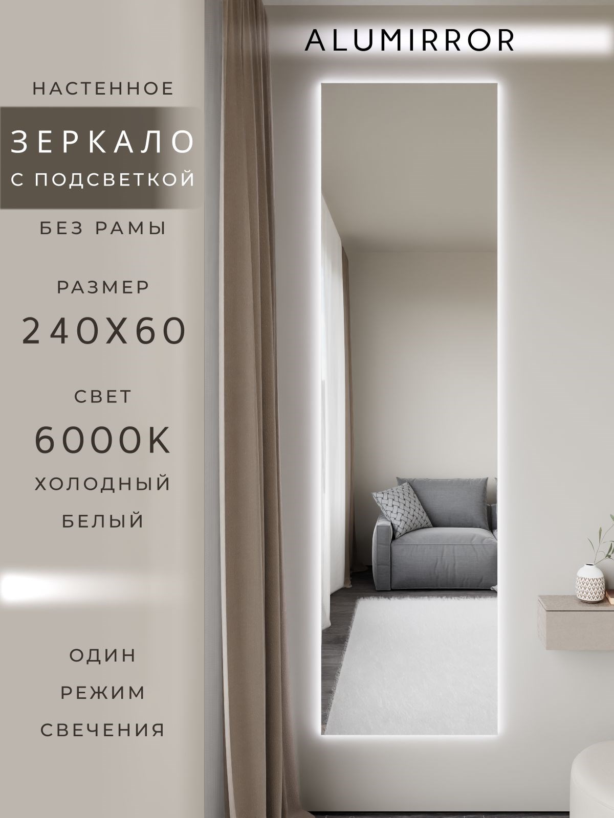 Зеркало настенное 240х60 см с подсветкой. Свет: Холодный белый 6000К. Без рамы интерьерное ALUMIRROR