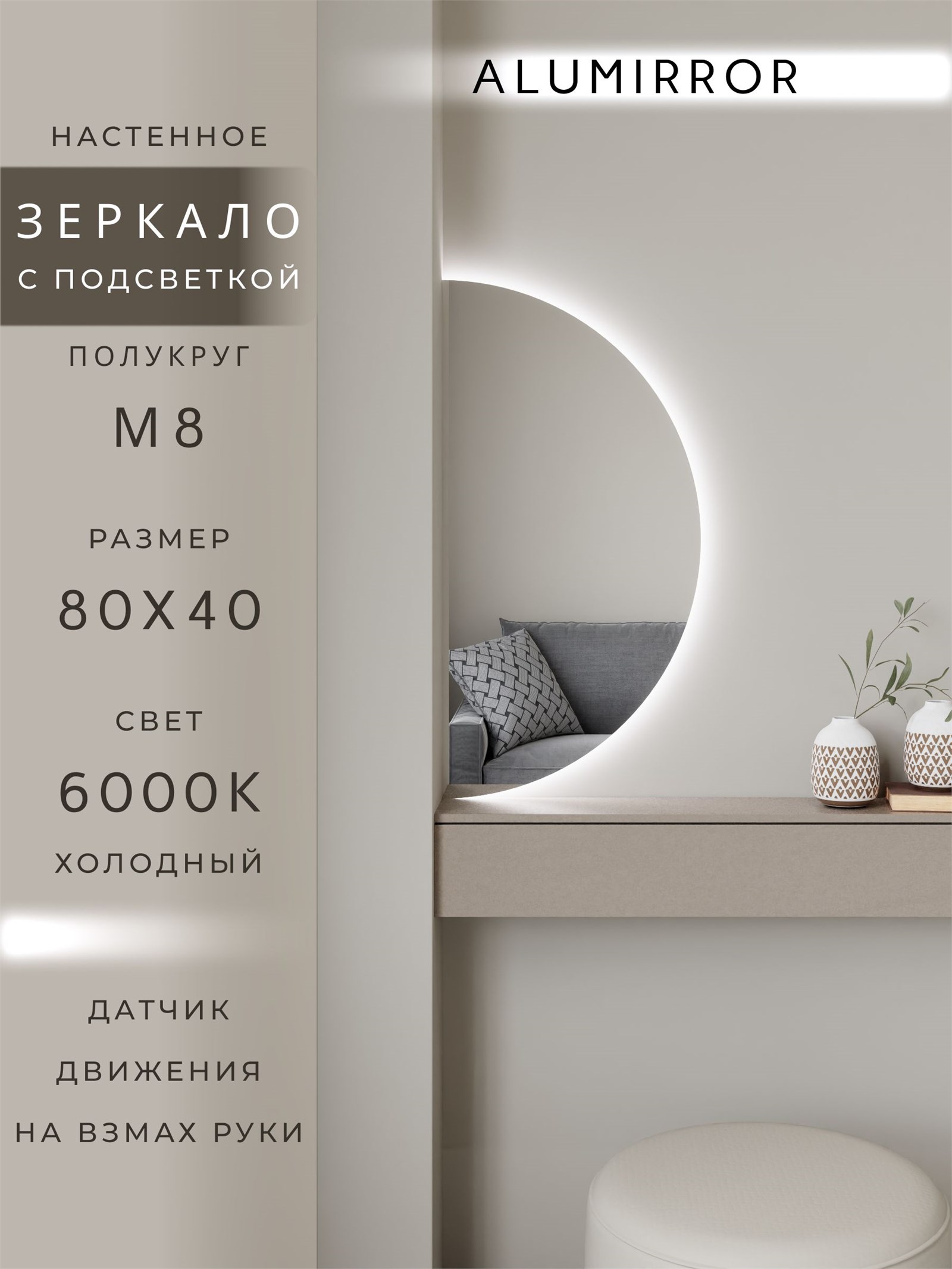 Зеркало настенное 80х40 холодный свет 6000К полукруглое с подсветкой М8 ALUMIRROR