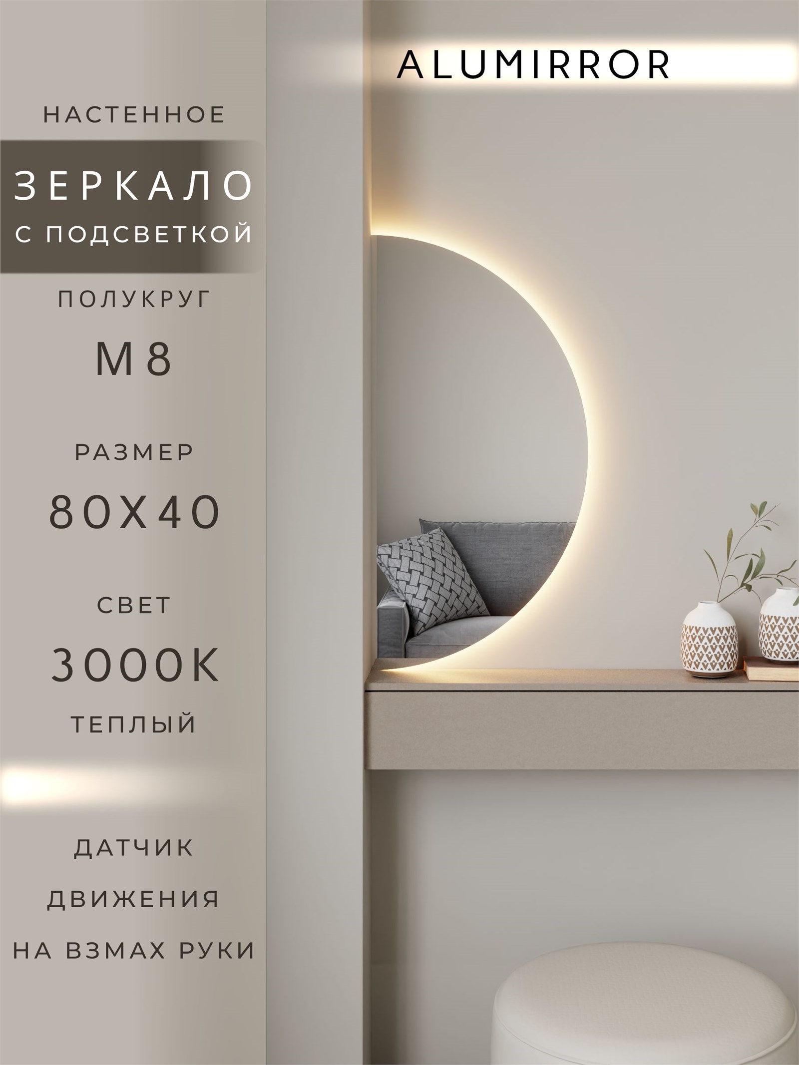 Зеркало настенное 80х40 теплый свет 3000К полукруглое с подсветкой М8 ALUMIRROR
