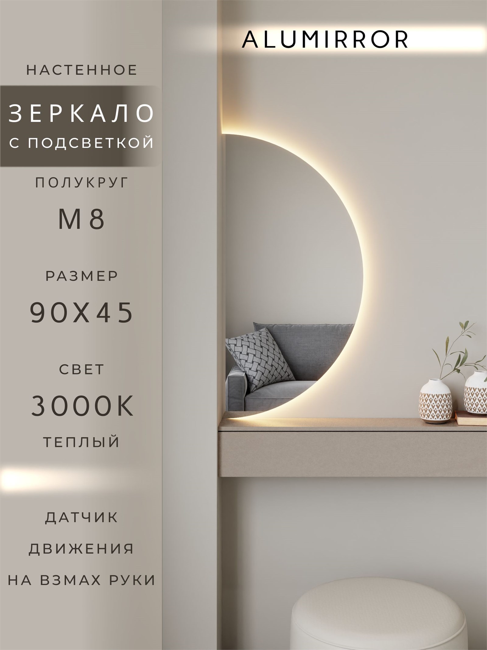 Зеркало настенное 90х45 теплый свет 3000К полукруглое с подсветкой М8 ALUMIRROR