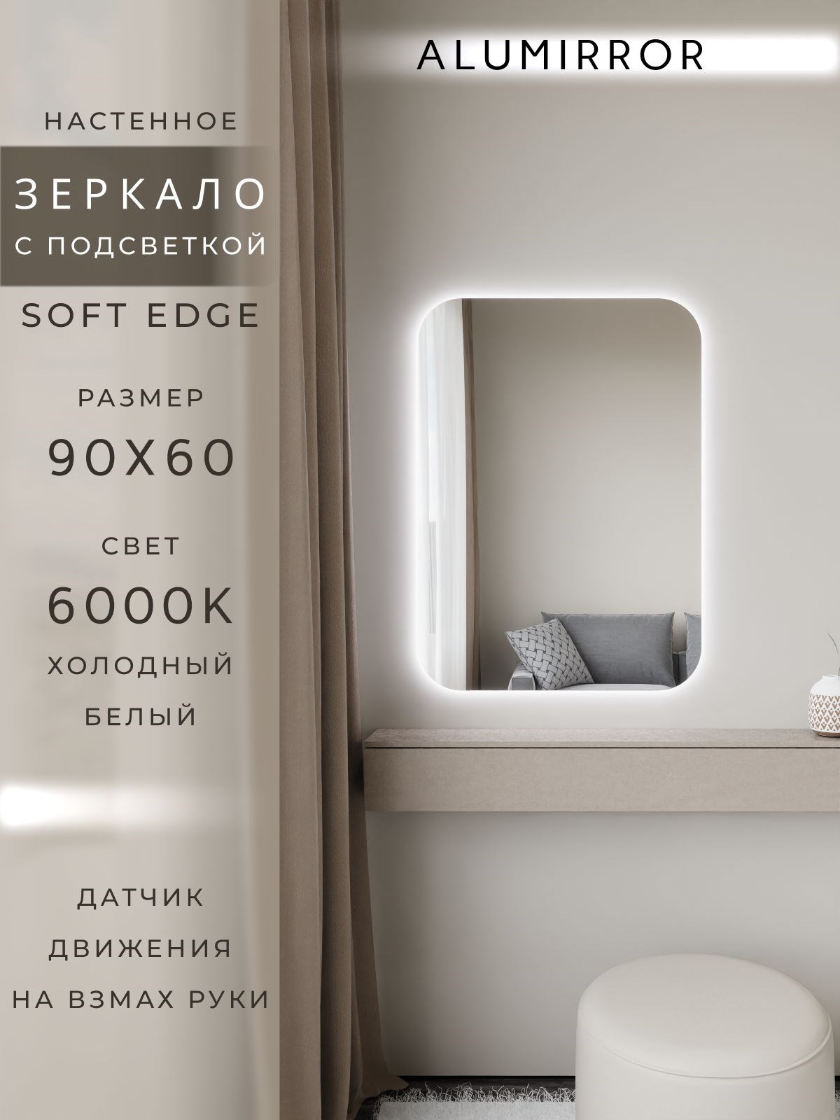 Зеркало настенное 90х60 см. мягкий квадрат ALUMIRROR с подсветкой холодный свет 6000К