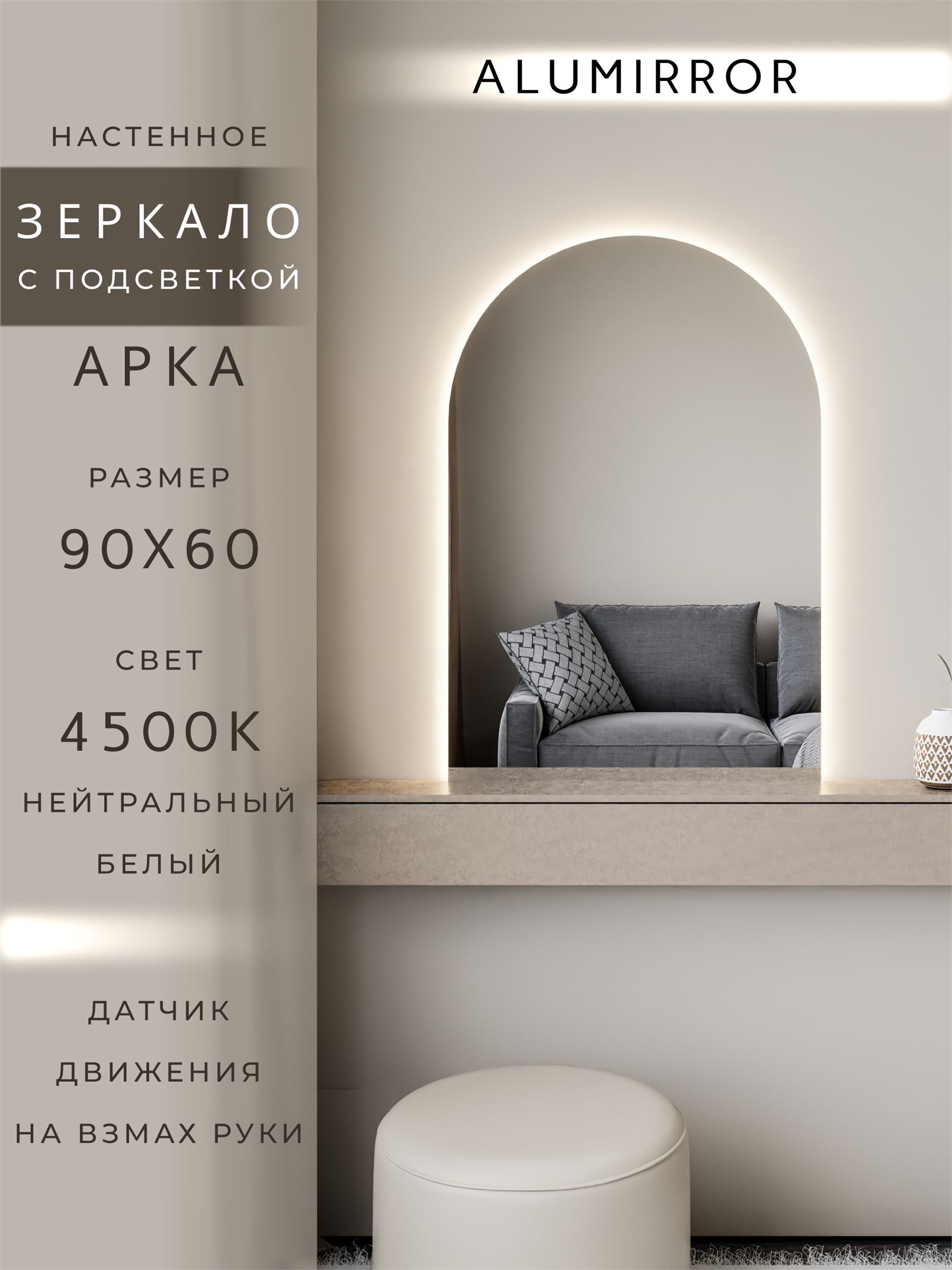 Зеркало настенное 90х60 см. нейтральный свет 4500К арочное с подсветкой М5 ALUMIRROR
