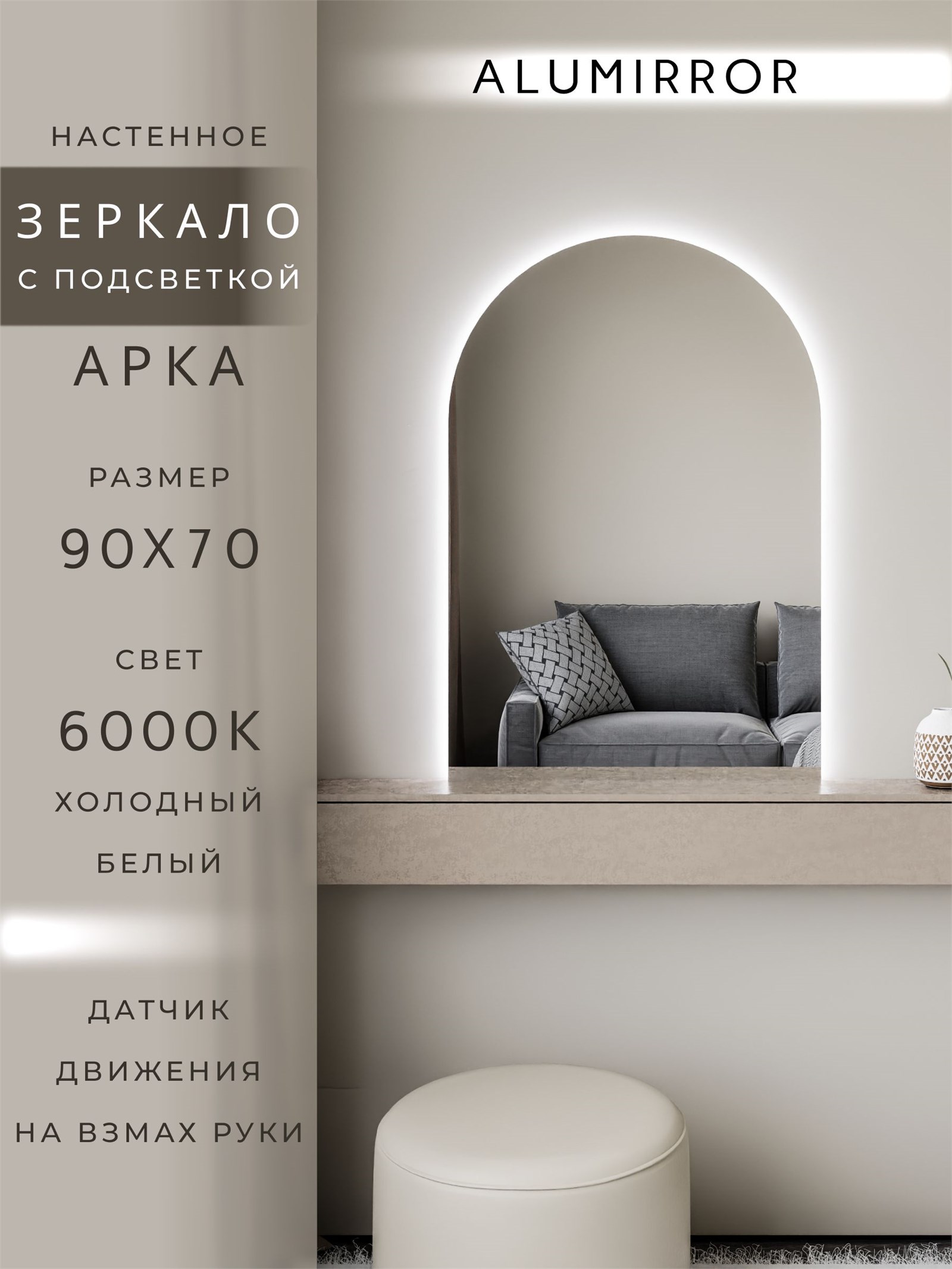 Зеркало настенное 90х70 см. холодный свет 6000К арочное с подсветкой М5 ALUMIRROR