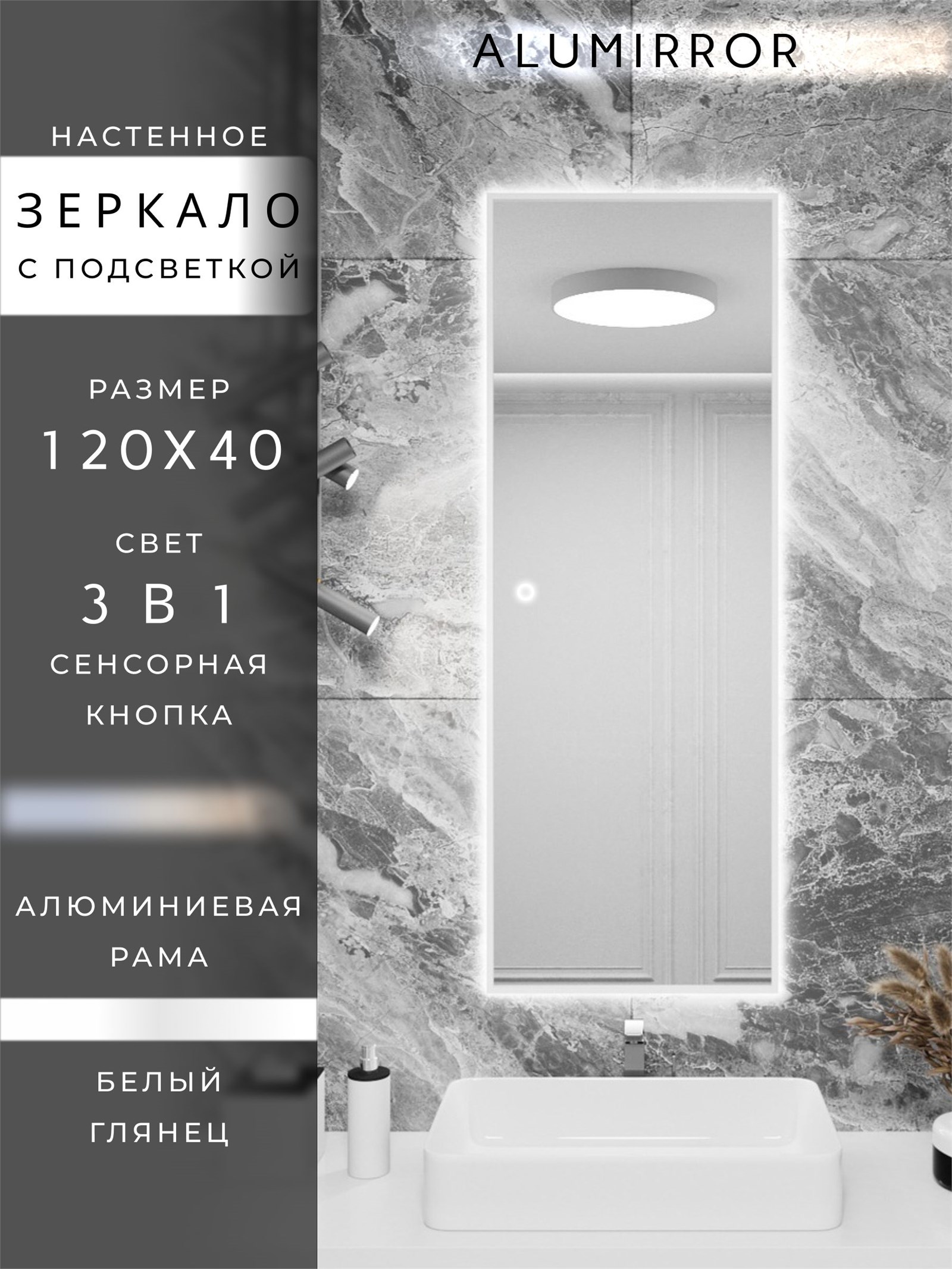 Зеркало настенное с сенсорной подсветкой ALUMIRROR – это идеальный выбор для вашего интерьера. Зеркало отлично подходит для создания стильного и современного образа в любом интерьере.Особенностью данного зеркала является удобная функция подсветки с помощью сенсора. Сенсорный выключатель подсветки позволит вам легко выбрать один из 3-х режимов освещения: (тёплый свет – 3000К, нейтральный свет – 4500К, холодный свет – 6000К), что особенно удобно в зависимости от времени суток и настроения. Используя зеркало с сенсором, вы получите не только функциональный элемент, но и возможность создать для вас уютную атмосферу в помещении. Зеркало данного размера идеально подойдет для размещения в прихожей, в спальне, в ванной комнате или любой другой комнате вашего дома, при этом подготовленные отверстия, с учетом ваших предпочтений позволяют установить зеркало как вертикально, так и горизонтально. Благодаря элегантной алюминиевой раме, изготовленной из высококачественного анодированного профиля российского производства, зеркало станет стильным акцентом в вашем интерьере. Алюминиевая рама подчеркнет элегантность вашего интерьера, и добавит в него изысканность. Для изготовления зеркала используется зеркальное полотно премиального качества, что позволит наслаждаться четким, красивым и ясным отражением без изъянов и искажений. Кроме того, зеркало обладает повышенной влагостойкостью, устойчиво к коррозии, и с обратной стороны для вашей безопасности защищено противоосколочной пленкой.Зеркало идеально подойдет для макияжа и ежедневного ухода за собой, необходимое освещение поможет вам создать идеальный образ и сделать каждое утро более комфортным. Оно станет незаменимым помощником при подготовке к важным мероприятиям.Не упустите возможность сделать ваше помещение более функциональным и красивым с помощью зеркала с сенсорной подсветкой ALUMIRROR. Создайте уникальную атмосферу и подчеркните свой вкус, выбрав это изысканное изделие.Если остались вопросы по приобретению зеркала, его характеристик или какие либо иные вопросы, которые хотите уточнить – напишите нам в разделе «Написать в магазин», мы обязательно вам ответим.