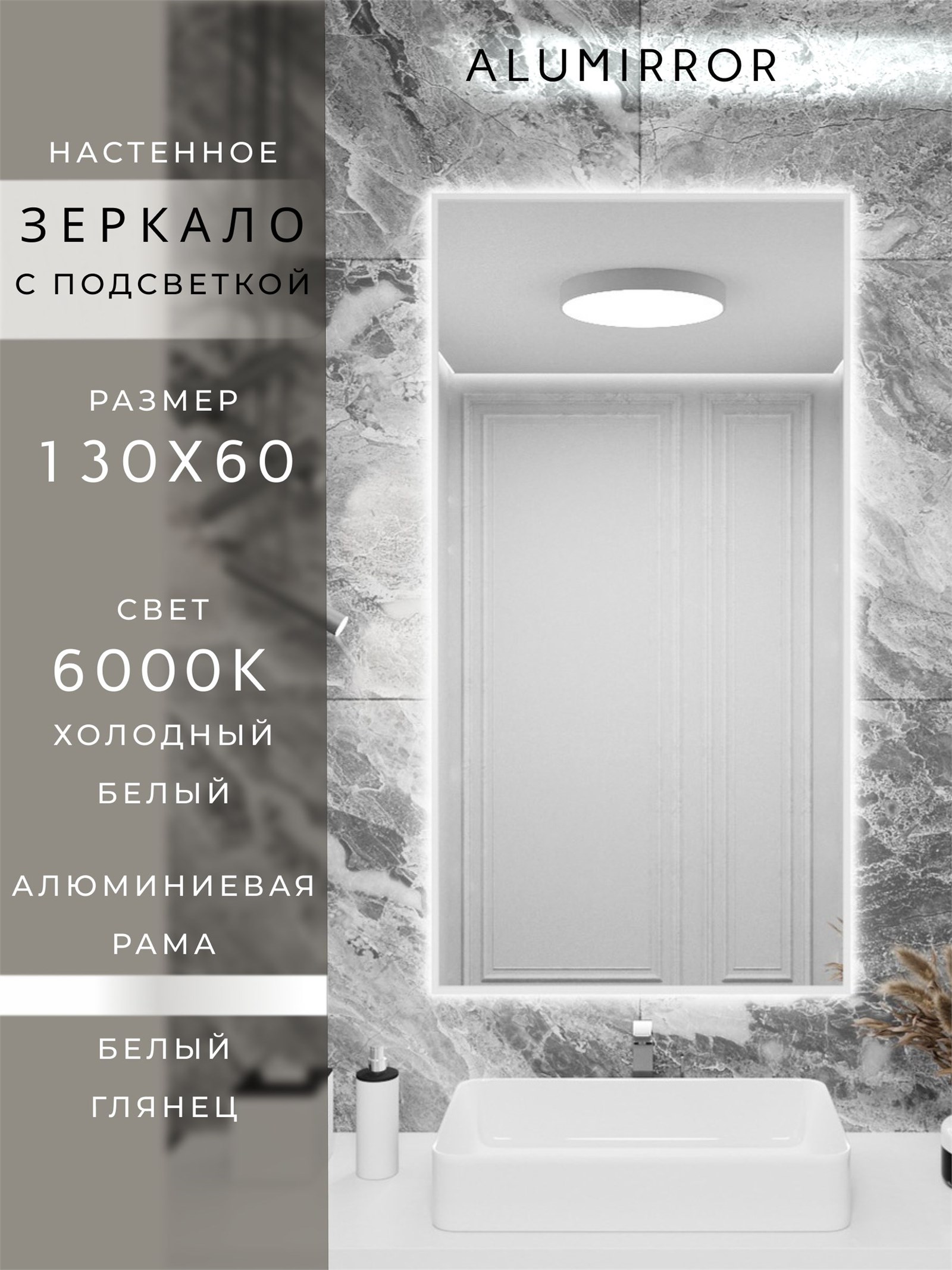 Зеркало в ванную 130х60 см с подсветкой. Свет: Холодный белый 6000К. В алюминиевой раме настенное ALUMIRROR
