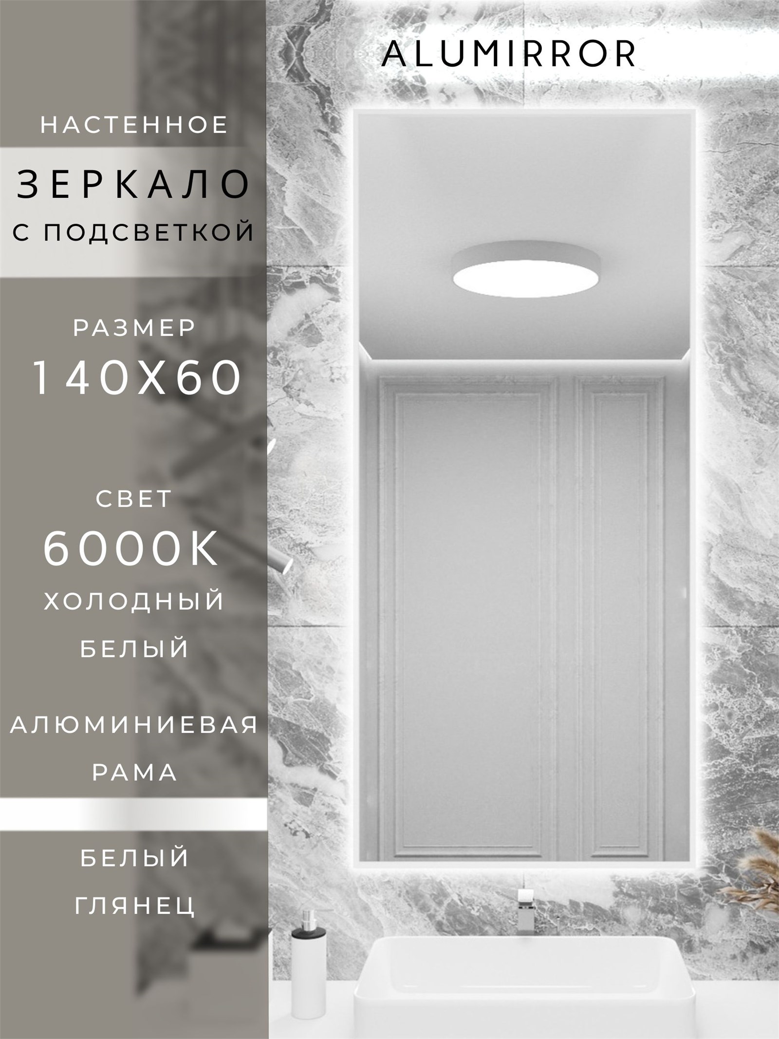 Зеркало в ванную 140х60 см с подсветкой. Свет: Холодный белый 6000К. В алюминиевой раме настенное ALUMIRROR