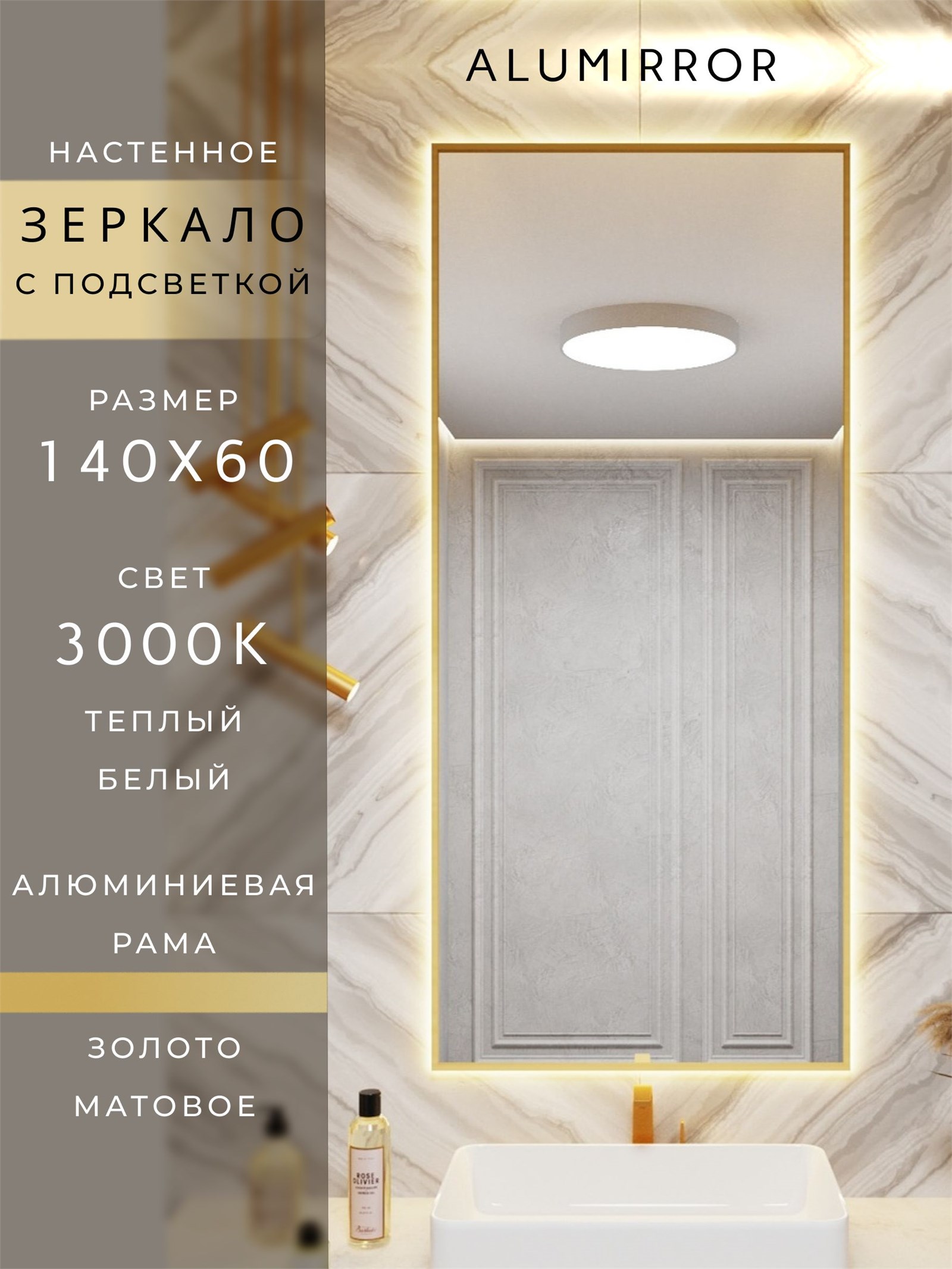 Зеркало в ванную 140х60 см с подсветкой. Свет: Теплый белый 3000К. В алюминиевой раме настенное ALUMIRROR