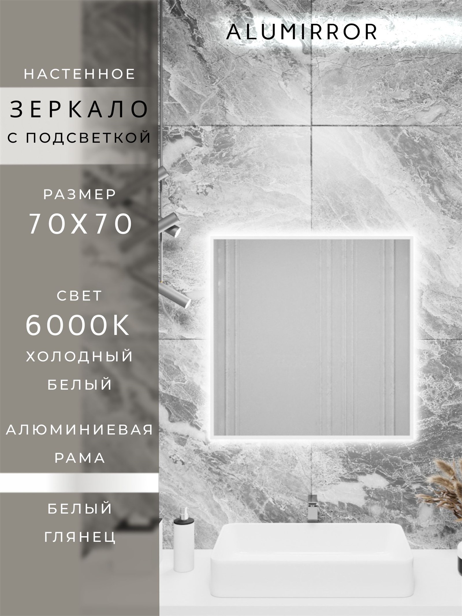 Зеркало в ванную 70х70 см с подсветкой. Свет: Холодный белый 6000К. В алюминиевой раме настенное ALUMIRROR
