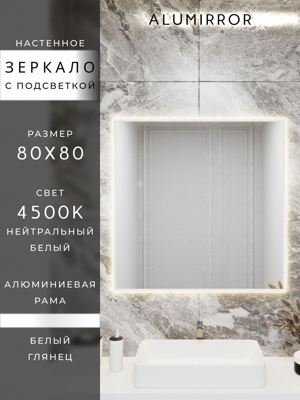Зеркало в ванную 80х80 см с подсветкой. Свет: Нейтральный белый 4500К. В алюминиевой раме настенное ALUMIRROR