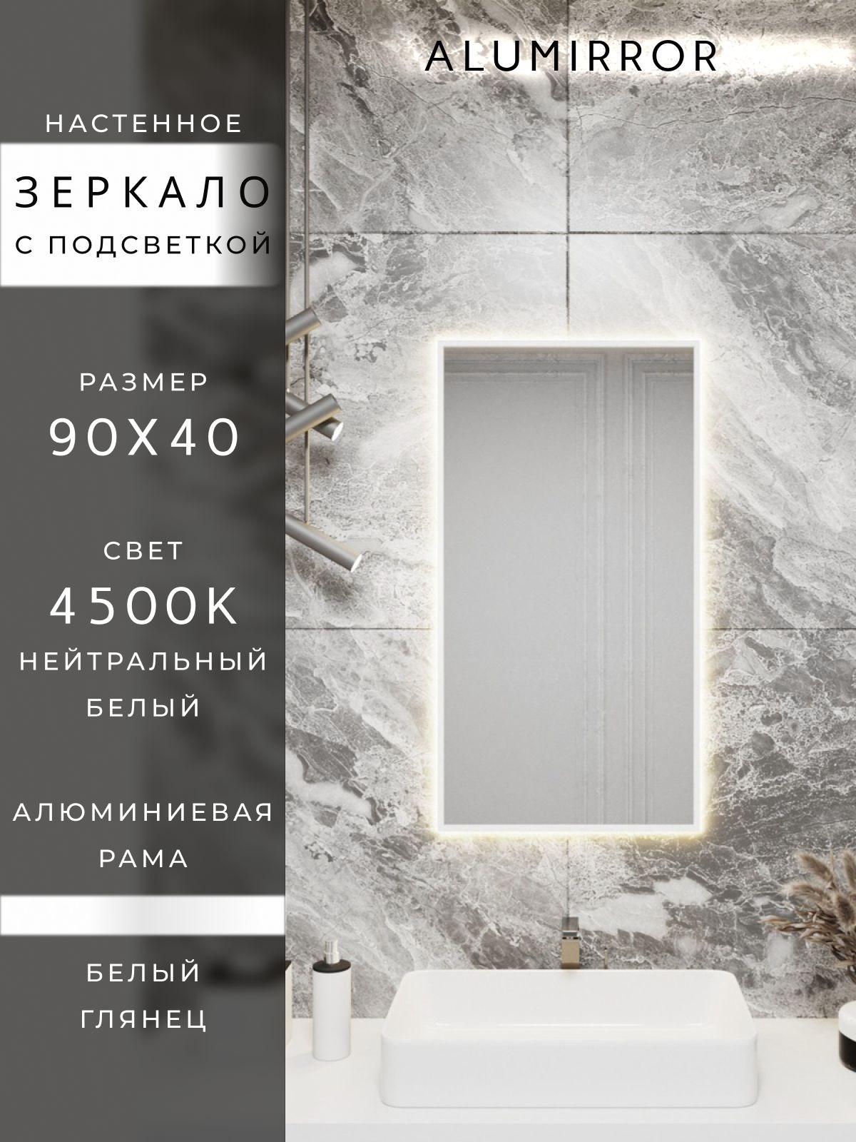 Зеркало в ванную 90х40 см с подсветкой. Свет: Нейтральный белый 4500К. В алюминиевой раме настенное ALUMIRROR