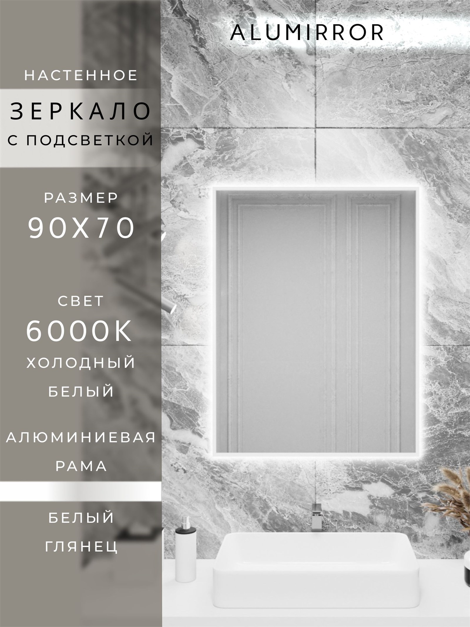 Зеркало в ванную 90х70 см с подсветкой. Свет: Холодный белый 6000К. В алюминиевой раме настенное ALUMIRROR